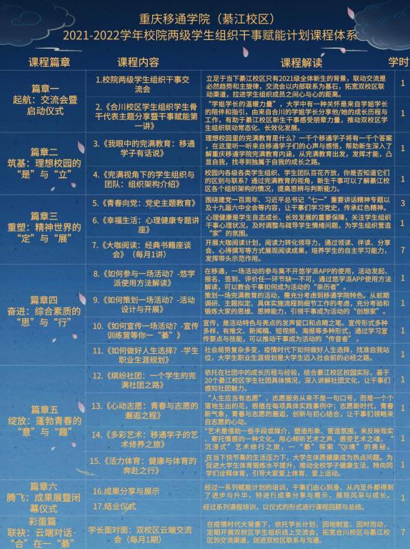 为搭建全校学生各类成长实践平台,提高綦江校区校、院两级学生组织的影响力,增强双校区校、院两级学生团队交流,进一步加强桥梁纽带作用,进一步提高学生组织的工作效率、工作质量、工作积极性,加强学生队伍的凝聚力、战斗力,提升学生组织的整体素质,特制定重庆移通学院(綦江校区)2021-2022学年校、院两级学生组织干事赋能计划课程体系,具体培训课程公布如下: