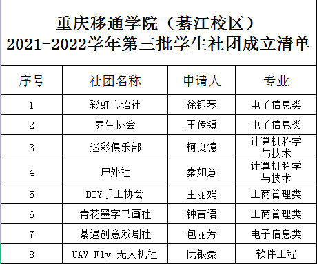 学生社团是我校推进完满教育的重要助力和实践平台,同时也是培养学生综合素质的重要载体。为了更加贴近同学们的兴趣爱好,开展我校完满教育工作,促进学生社团的蓬勃发展,使得学生社团发展种类日益丰富,结合綦江校区现目前社团活动开展实际情况,对第三批学生社团的资格审查、运营发展、目标规划等情况进行综合评估,经校团委讨论决定后,现公布第三批学生社团的成立清单,望全体学生能根据自己的喜好选择加入心仪的社团。