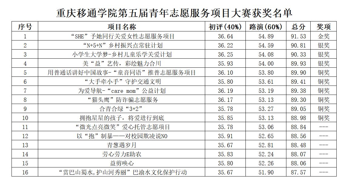为深入学习贯彻习近平新时代中国特色社会主义思想,进一步落实习近平总书记系列重要讲话,推动我校志愿服务制度体系建设,校团委于2022年2月启动了重庆移通学院第五届青年志愿服务项目大赛,本次志愿服务项目大赛以“青春中国梦,志愿我先行”为主题来推动我校志愿服务的稳步发展,引导广大青少年立足新时代,展现新作为,以实际行动书写新时代。经过初赛项目书评审、决赛路演答辩,现将比赛结果公布如下: