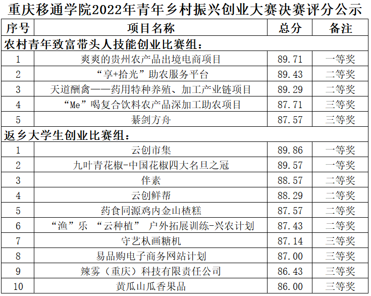 为大力发现、选拔和培育农村创业青年人才,助力全面推进乡村振兴,搭建支持移通涉农创业青年的展示交流、导师辅导、投融资对接、项目孵化等服务平台,促进涉农创业青年弘扬创业精神、培养创业意识、提升创业能力、提高创业成功率,校团委联合就业创业指导与服务中心举办了重庆移通学院2022年青年乡村振兴创业大赛,通过初赛对所提供材料的评审,从农村青年致富带头人技能创业组评出5个项目晋级决赛,从返乡大学生创业组评出10个项目晋级决赛。评委根据决赛参赛项目路演视频对项目运营现状、社会效益、未来价值等情况进行综合评审,现将决赛评分及结果公示如下: