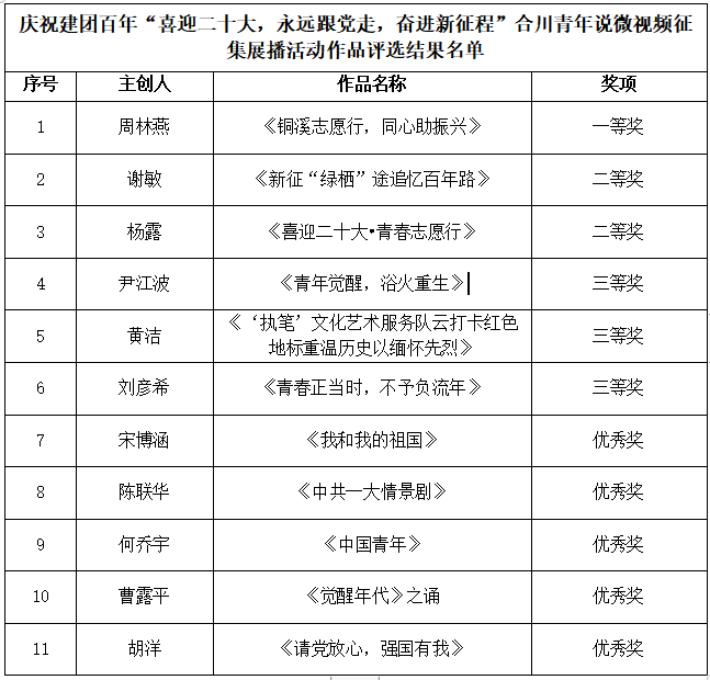 为喜迎党的二十大庆,祝建团100周年,深入开展“喜迎二十大,永远跟党走,奋进新征程”主题教育实践活动。我校团委、通信与信息工程学院团总支于2022年5月举办“喜迎二十大,永远跟党走,奋进新征程”合川青年说微视频征集展播活动。激励引领广大团员青年深入学习贯彻习近平新时代中国特色社会主义思想。展现我校广大团员青年积极向上、奋发有为的精神风貌,坚定不移跟党走、勇担历史使命的青年力量。经过作品征集、集中评选,现将作品评选结果公布如下: