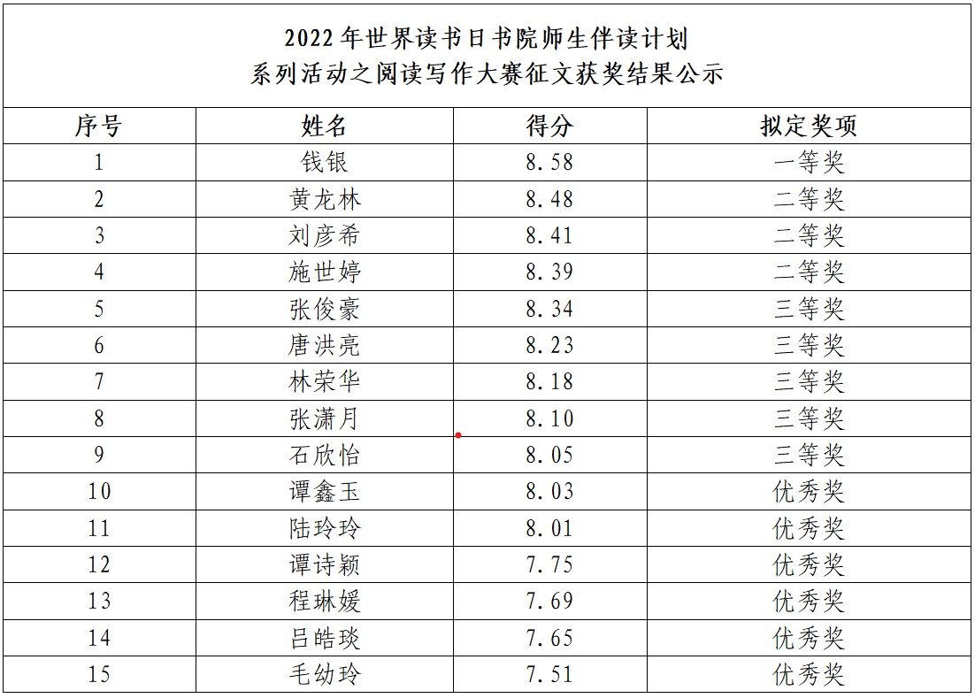 重庆移通学院2022年世界读书日书院师生伴读计划系列活动之阅读写作大赛征文活动于4月份启动,是共青团重庆移通学院委员会、重庆移通学院创意写作学院、重庆移通学院书院部在全校范围内(合川校区)对“信息产业大咖传记阅读计划”开展的阅读写作征文活动,经学生个人自主申报、学院推荐、大赛评审委员会评选等流程,现评出2022年世界读书日书院师生伴读计划系列活动之阅读写作大赛征文获奖学生15名,其中,一等奖1名,二等奖3名,三等奖5名,优秀奖6名,具体名单公示如下。