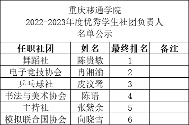 现将2022-2023学年优秀学生社团负责人暨第三届“灯塔”学生社团负责人技能大赛评选结果公示如下: