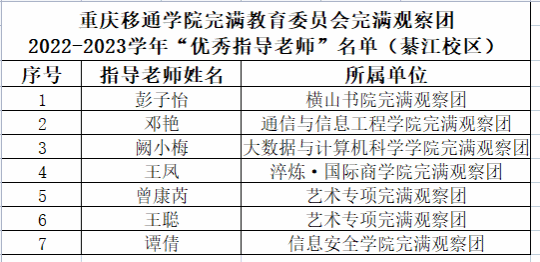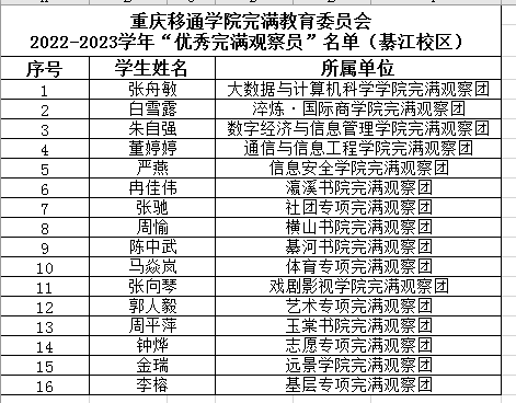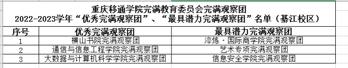 完满观察团作为完满教育活动质量提升的工作的骨干力量之一,在完满教育活动和工作开展中发挥着不可忽视的作用。为推动完满教育更稳、更快、更好的开展,同时加强完满观察团团队建设,激励各观察员在以后工作中更积极踊跃地发挥“温度计”的本色作用,现将2022-2023学年綦江校区“优秀完满观察员”、“优秀指导老师”、“优秀完满观察团” 和“最具潜力完满观察团”评选结果公示如下: