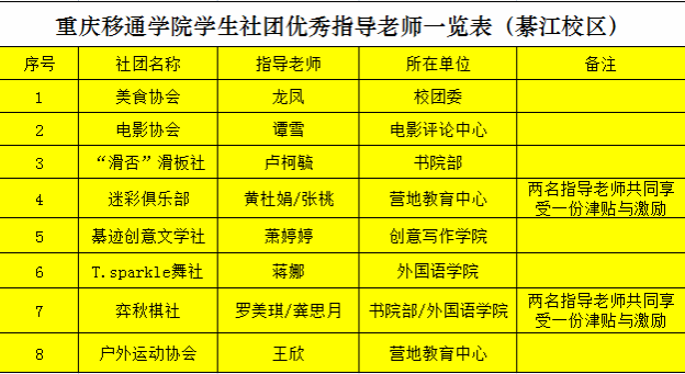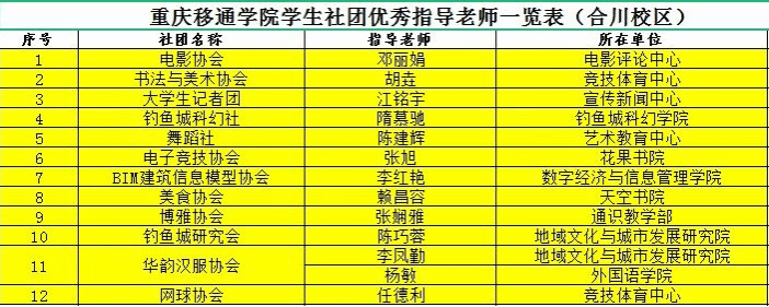 根据《重庆移通学院学生社团指导老师评优考核管理办法》,校团委牵头组织对双校区109个学生社团指导老师收取的2022-2023学年考核材料进行审核,从社团日常活动和基础考核得分、指导老师参与日常工作得分、社团满意度调查三个方面进行材料合格评定。经综合评定,双校区学生社团优秀指导老师名单如下: