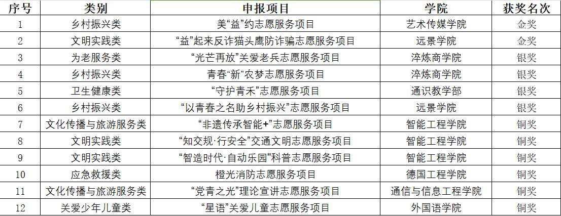 为进一步落实我校“完满教育”育人理念,推动我校志愿服务工作制度化、常态化、项目化,校团委于11月初发起重庆移通学院合川校区第六届青年志愿服务项目大赛,经过申报推选、初赛评审共评选出18个志愿服务项目入围决赛,于12月13日开展决赛,根据志愿服务项目奖励规定,本次大赛共设置金奖项目2个、银奖项目4个、铜奖项目6个。特将重庆移通学院第六届青年志愿服务项目大赛获奖结果公示如下: