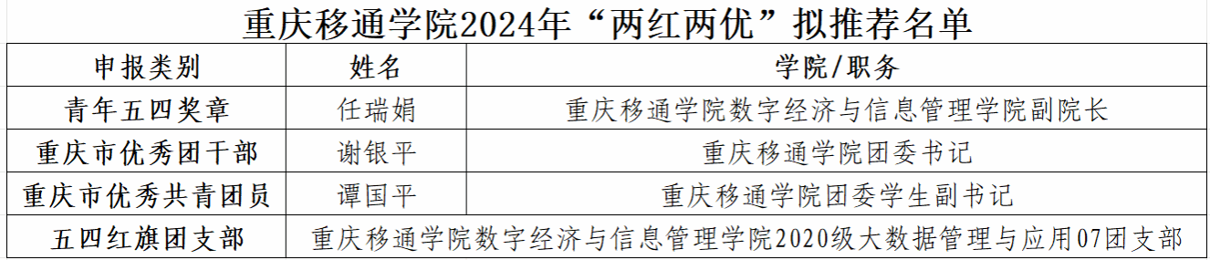 为深入学习宣传贯彻党的二十大精神和习近平总书记关于青年工作的重要思想,充分发挥先进典型示范引领作用,激励广大团组织和团员、团干部比学赶超、创先争优。根据(渝人社发〔2024〕4 号)关于评选表彰《2024年“重庆青年五四奖章”“重庆市五四红旗团委”“重庆市五四红旗团支部”“重庆市优秀共青团员”“重庆市优秀共青团干部”》的通知,经自主申报、学院推选、审核评选,现将重庆移通学院2024年“两红两优”拟推荐名单予以公示: