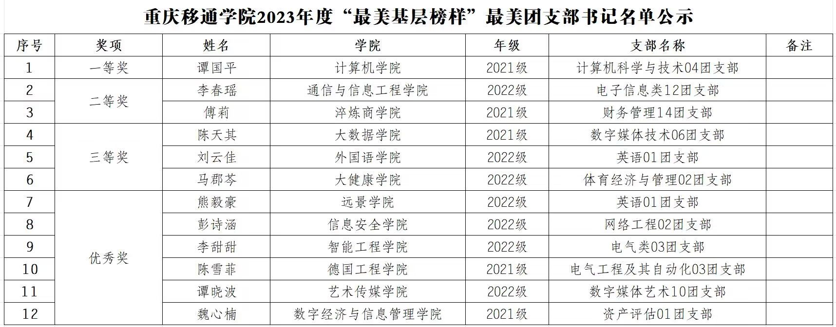 通过自主申请、学院选拔,共计推选12名团支部书记成为校级最美团支部书记候选人,由校团委牵头开展重庆移通学院2023年度“最美基层榜样”最美团支部书记评选,共计评选出1名一等奖,2名二等奖,3名三等奖,6名优秀奖。现将重庆移通学院2023年度“最美基层榜样”最美团支部书记获奖名单公布如下:
