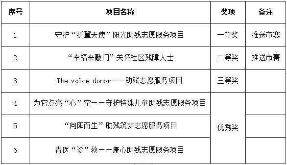 校团委自2024年4月10日下发《关于开展“学习二十大、永远跟党走、奋进新征程”重庆移通学院助残志愿服务项目大赛》的通知,经过前期的项目收集、材料审查等环节,组织双校区各二级学院相关教师作为评委,经过评选,共评选出一、二、三等奖各1个、优秀奖3个,并推报2个项目参加重庆市助残志愿服务项目大赛。关于“学习二十大、永远跟党走、奋进新征程”重庆移通学院助残志愿服务项目大赛获奖名单如下: