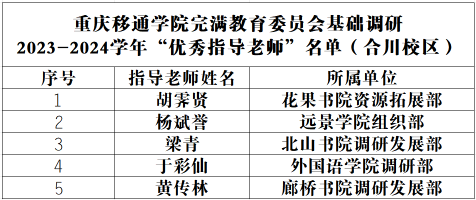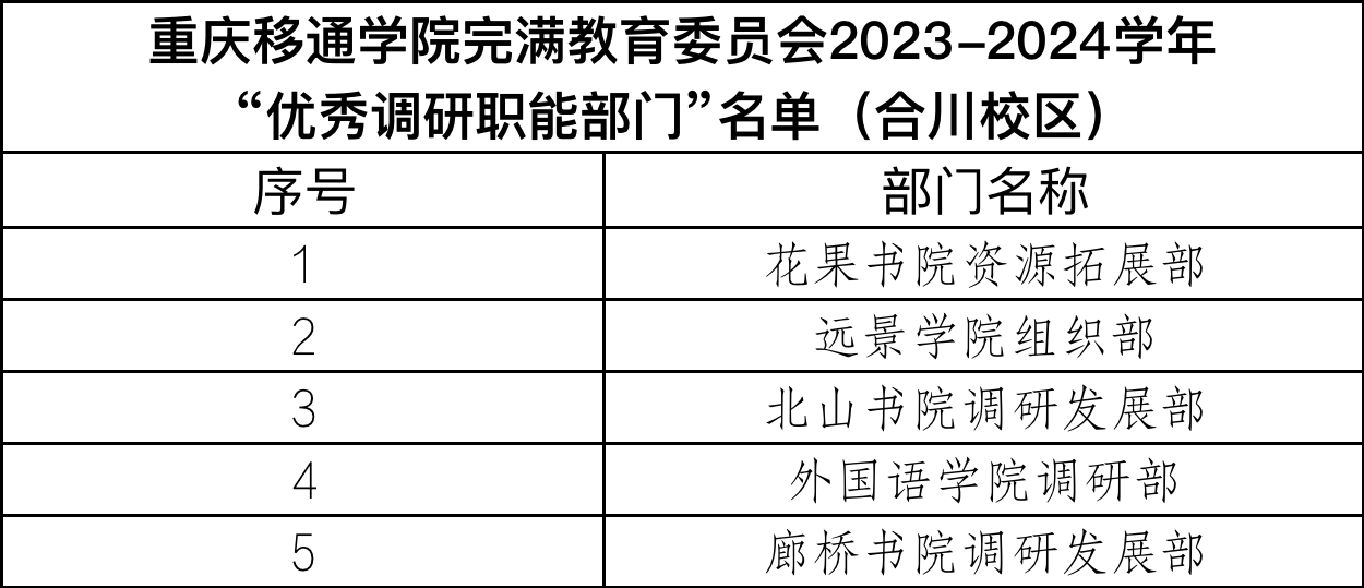 现将重庆移通学院(合川校区)2023-2024学年优秀调研职能部门及优秀指导教师最终结果公示如下: