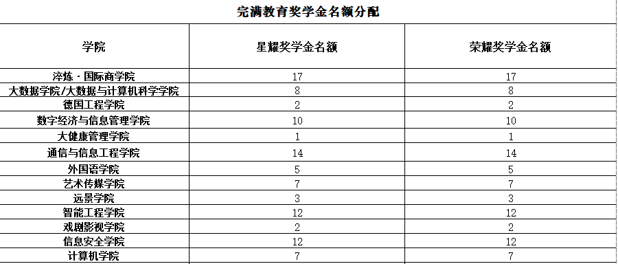 完满教育奖学金分为星耀奖学金(一等)和荣耀奖学金(二等)两种;评选设星耀奖学金100名,奖金为每生2000元;荣耀奖学金100名,奖金为每生1000元。各二级学院名额分配如下: