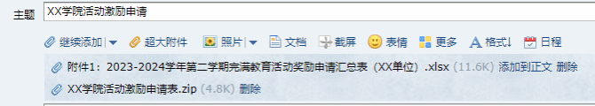 提交注意:附件1《2023-2024学年完满教育委员会活动激励奖金汇总表【学生序列】(模板)》由各单位统一汇总,各书院由书院部统一打包,涉及双校区的单位由合川校区统一收集提交电子档,纸质档双校区分开提交;附件2《活动奖励申请表》请各申请学生提交至获奖所属单位负责老师处,学生自主参加的比赛所获奖统一提交至学院处,并在该附件后贴上相关获奖佐证材料(相关获奖表彰文件、奖状等图片形式并备注)形成一个文档,请按照要求完整的填写文件,文件打包发送如图:
