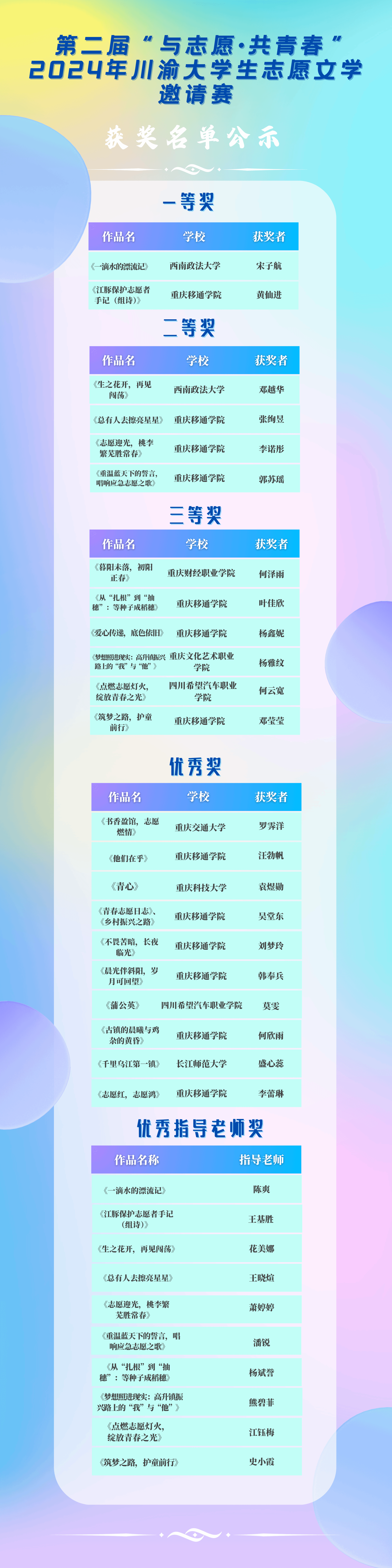 自大赛启动以来,累计收到来自重庆大学、重庆西南政法大学、四川大学、成都理工大学等45所高校的682篇原创作品。经自主创作、报名投稿、初审评选、复审评选等环节,最终由中国青年报、重庆市青年志愿者协会、重庆市网络作家协会相关作家、媒体人以及重庆移通学院创意写作学院、新闻采写产业学院文学专家组成评审委员会,评选出22个优秀作品,以及11名优秀指导老师,现将获奖名单予以公示。