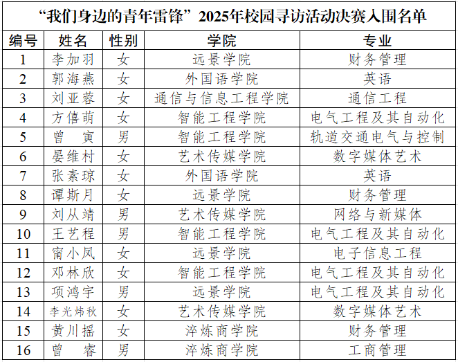 为将雷锋精神深植师生心中,充分发挥青年榜样的引领作用。3月6日,校团委面向全校开启2025年“我们身边的青年雷锋”校园寻访活动,以我们身边的雷锋为典型,激发我校师生的无私奉献精神,旨在营造一个“雷锋精神,人人可学:奉献爱心,处处可为”的校园氛围。