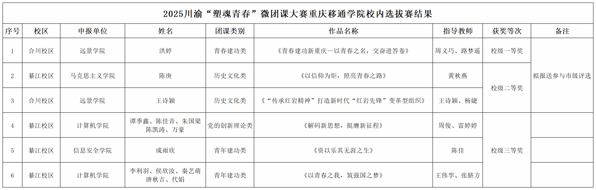 为充分发挥共青团在高校思想政治工作中的引领力,强化共青团员的理论与实践教育,提升团员青年的政治素养和思辨创新能力。校团委按照团市委相关工作要求,举办第44届“动感地带”川渝“校园之春”文化艺术体育科技活动之“塑魂青春”川渝校园微团课大赛重庆移通学院校内选拔赛。经学院推荐、校级初评、终选讲演答辩三个环节,双校区最终评选出6个优秀微团课作品拟获得校级一、二、三等奖,其中排名前三位的优秀微团课作品拟报送市级评选。现将相关情况公示如下: