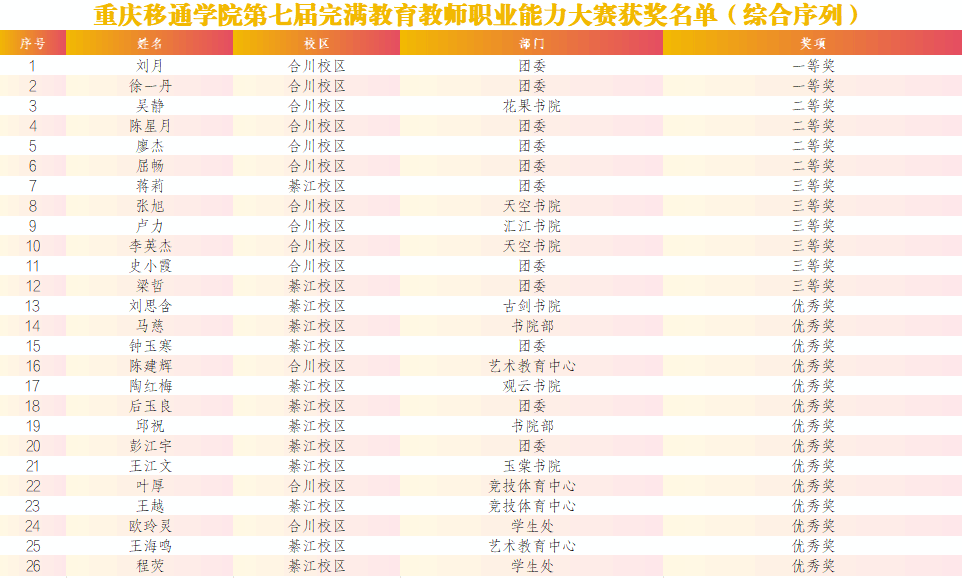 为深入贯彻落实全国教育大会、全国高校思想政治工作会议和习近平总书记重要讲话精神,落实立德树人根本任务,提高完满教育工作团队的业务水平,突出以赛代练、以赛代训,强化以赛促学、以赛促建,进一步促进完满教育系统教师深入了解工作的理论、规律、方法,强化责任担当,提高业务能力,进而强化完满教育队伍职业化、专业化、专家化发展,学校举办第七届完满教育教师职业能力大赛(综合序列)比赛,本次大赛从4月开赛以来,经过各部门初赛的选拔推荐、学校复赛基础知识测试选拔、决赛后,现将获奖名单公示如下: