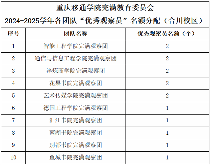 最终总成绩前五名的完满观察团获得2个“优秀观察员”名额,第六名至第十名的完满观察团获得1个“优秀观察员”名额,现将重庆移通学院(合川校区)2024-2025学年各组织“优秀观察员”名额分配情况公示如下: