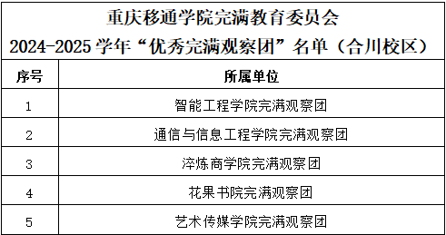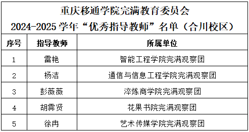 现将重庆移通学院(合川校区)2024-2025学年“优秀完满观察团”及“优秀指导教师”最终结果公示如下: