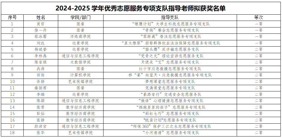 为切实加强指导教师对志愿服务专项支队的指导、建设与支持作用,促进志愿服务专项支队健康有序发展,根据《重庆移通学院学生社团及志愿服务专项支队指导教师管理办法(试行)》(移通〔2024〕177号)文件,由校团委牵头,双校区同频共振,经过前期的自主申报、材料审核等环节,最终双校区共28名指导老师进入终选答辩。在组织双校区职能部门、二级学院相关负责老师作为评委,对参评指导老师的材料进行现场评审打分,经并经过公平公正答辩、评选,现将参评指导老师终选答辩结果进行公示。公示期3天,公示期间如有异议,请各指导老师联系对应校区进行反映。