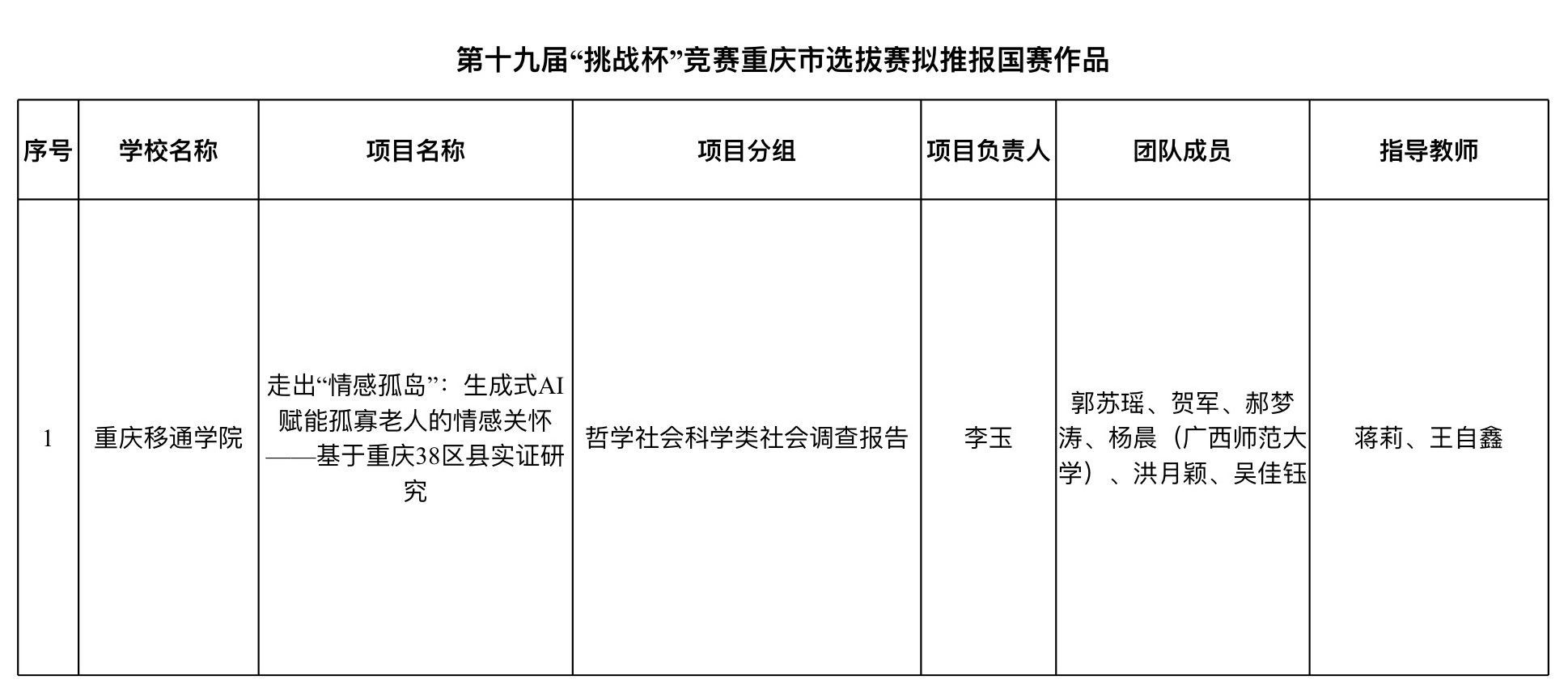 由团市委、市教委、市科协、市社科联、重庆社科院和市学联决定共同举办第十九届“挑战杯”全国大学 生课外学术科技作品竞赛重庆市选拔赛落下帷幕。经过市赛复赛、市赛决赛的层层选拔,重庆移通学院1个项目入围国赛。现予以公示,详细信息如下: