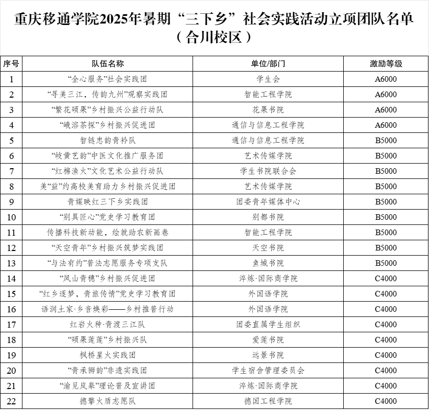根据团中央、团市委相关文件精神,按照《关于开展重庆移通学院2025年大学生暑期文化、科技、卫生“三下乡”社会实践活动的通知》要求。今年首次推行“内部选拔+校级答辩”的分层机制,二级学院、特色职能部门、各级学生组织先开展内部评选,合川校区按照在校生人数的1‰共推荐22支优秀队伍参与校级招投标,现将结果进行公示。