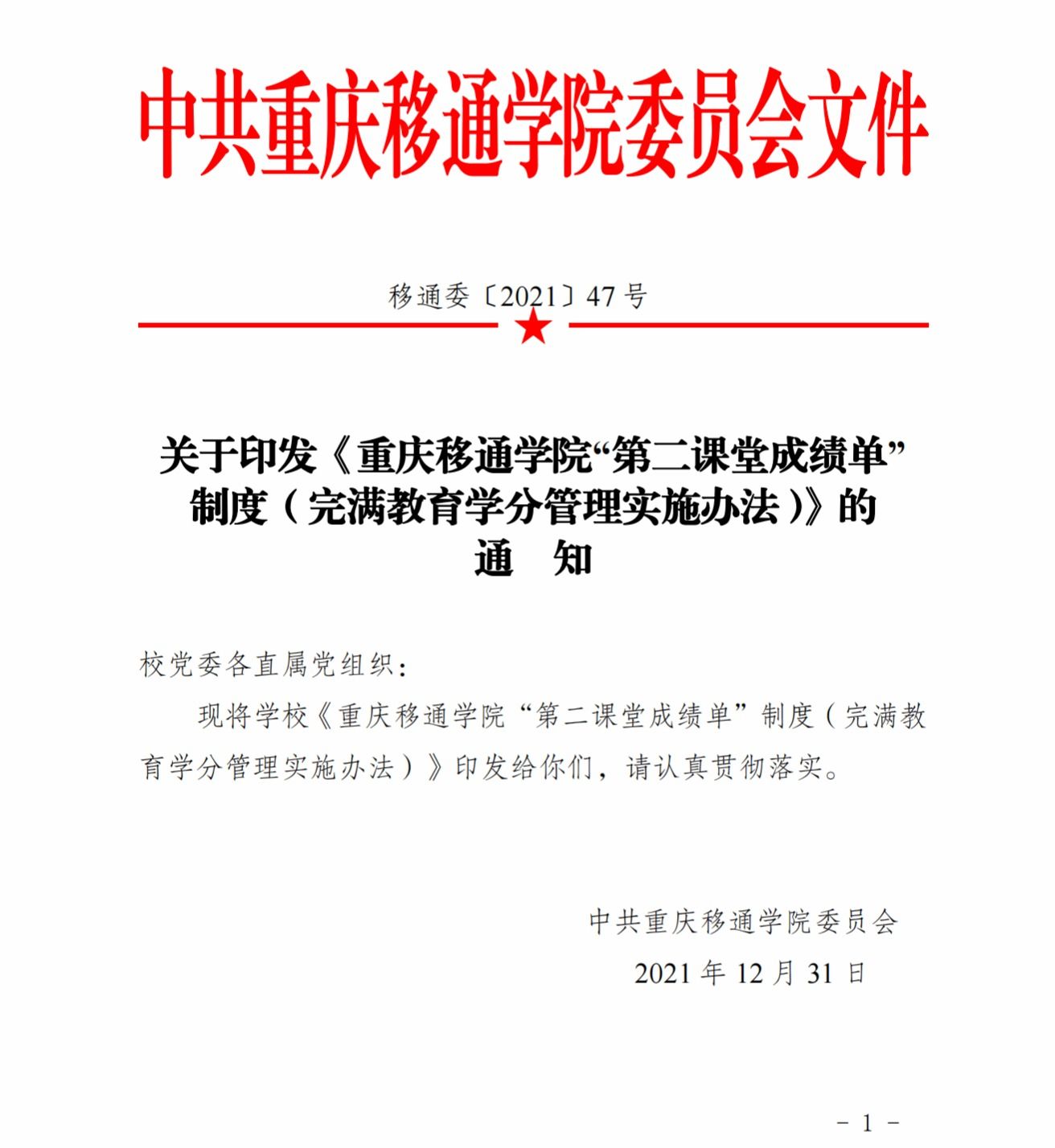 附件1:移通委〔2021〕47号关于印发《重庆移通学院重庆移通学院“第二课堂成绩单”制度(完满教育学分管理实施办法)》的通知.pdf