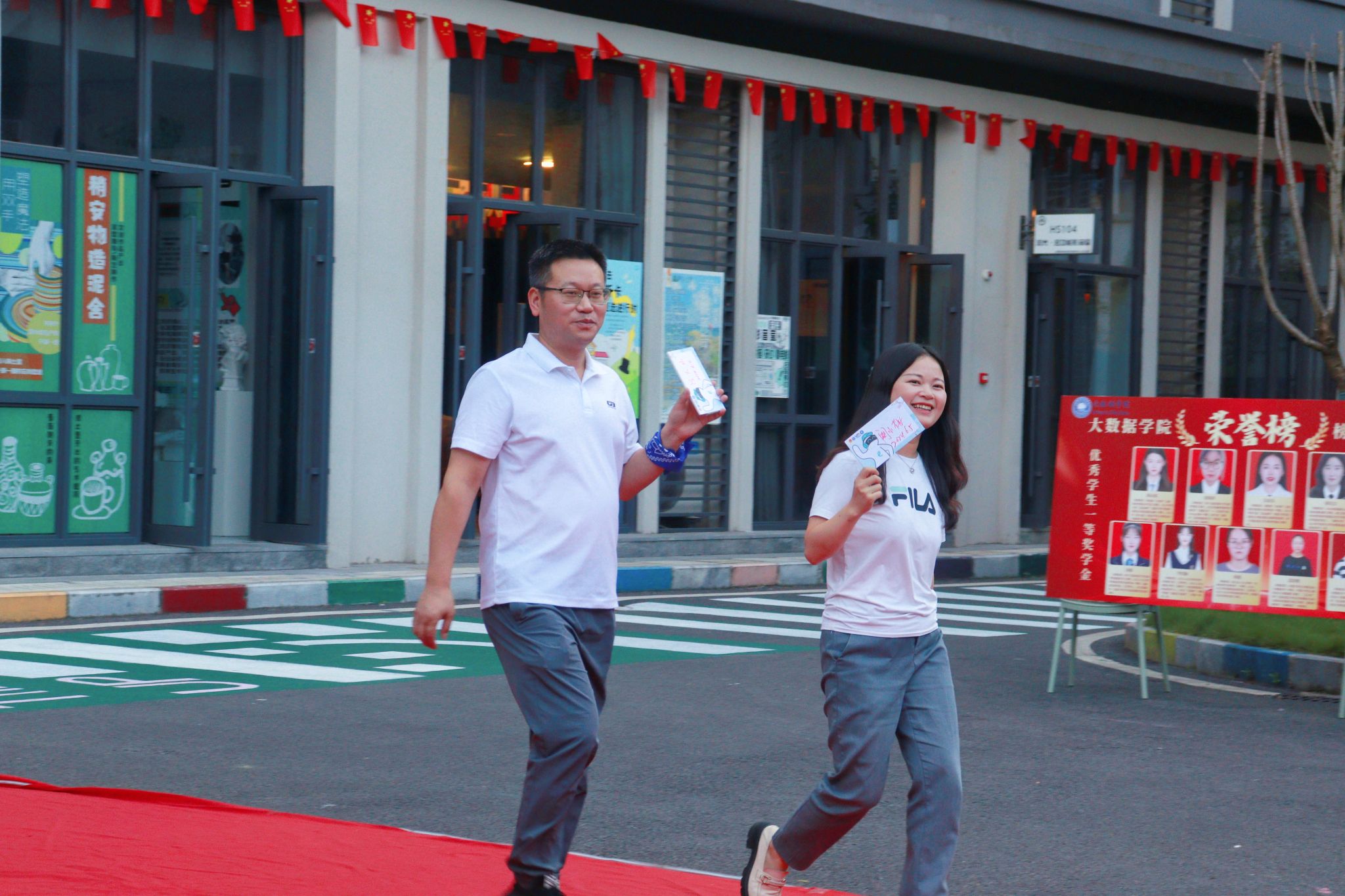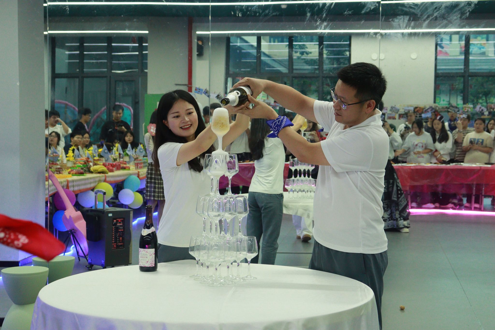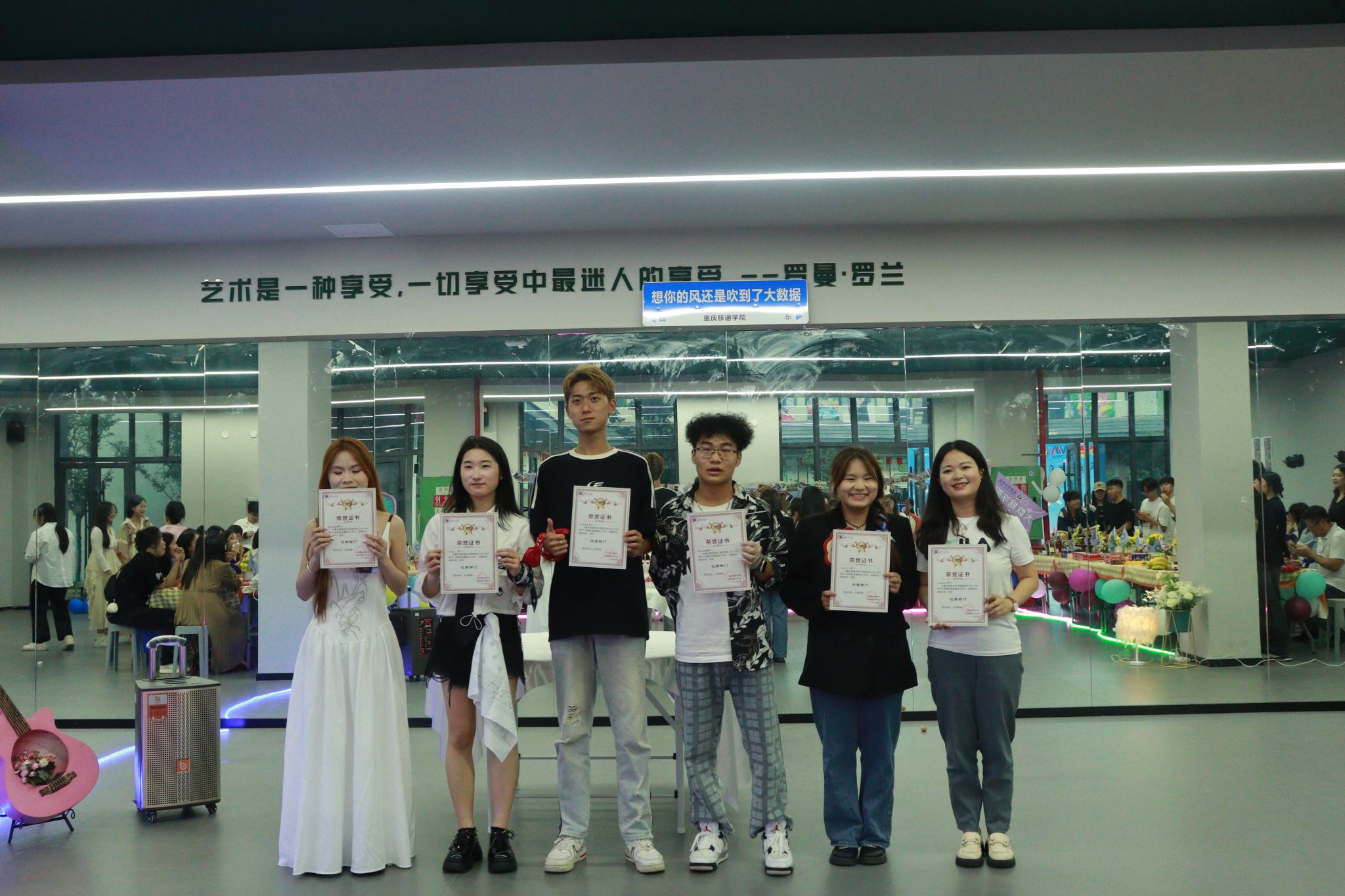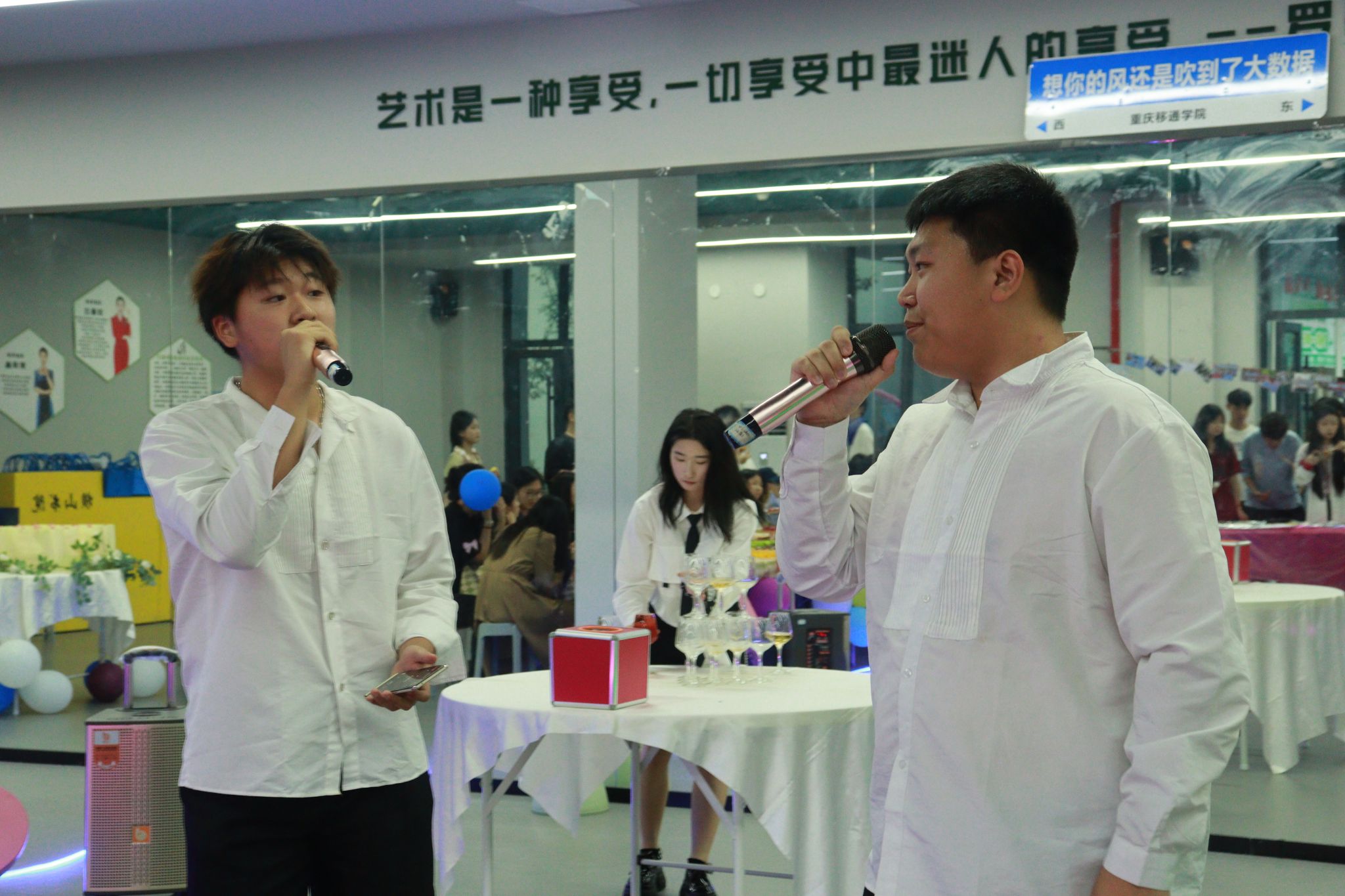酒会开始前,副院长吕云山、副院长阙小梅共同开启香槟,宣布表彰酒会正式启幕。酒会上,学院向表现突出的学生组织部门进行了表彰,肯定和鼓励部门在未来完满教育活动中再接再励、创造新高。酒会期间,欢快氛围贯穿了全过程,此外酒会还穿插了两次激动人心的抽奖环节,给酒会现场增添了更多的欢乐与笑声,全体人员共同感受过去这个学期辛勤工作过后的欢乐。文艺部的精彩节目赢得了大家的声声喝彩,学生主席们倾情演唱了歌曲《当》,展示出了团队凝聚力和向心力,而辅导员老师们的节目将晚会氛围推向了高潮,也展现了大数据学院师生们的多才多艺与青春活力。