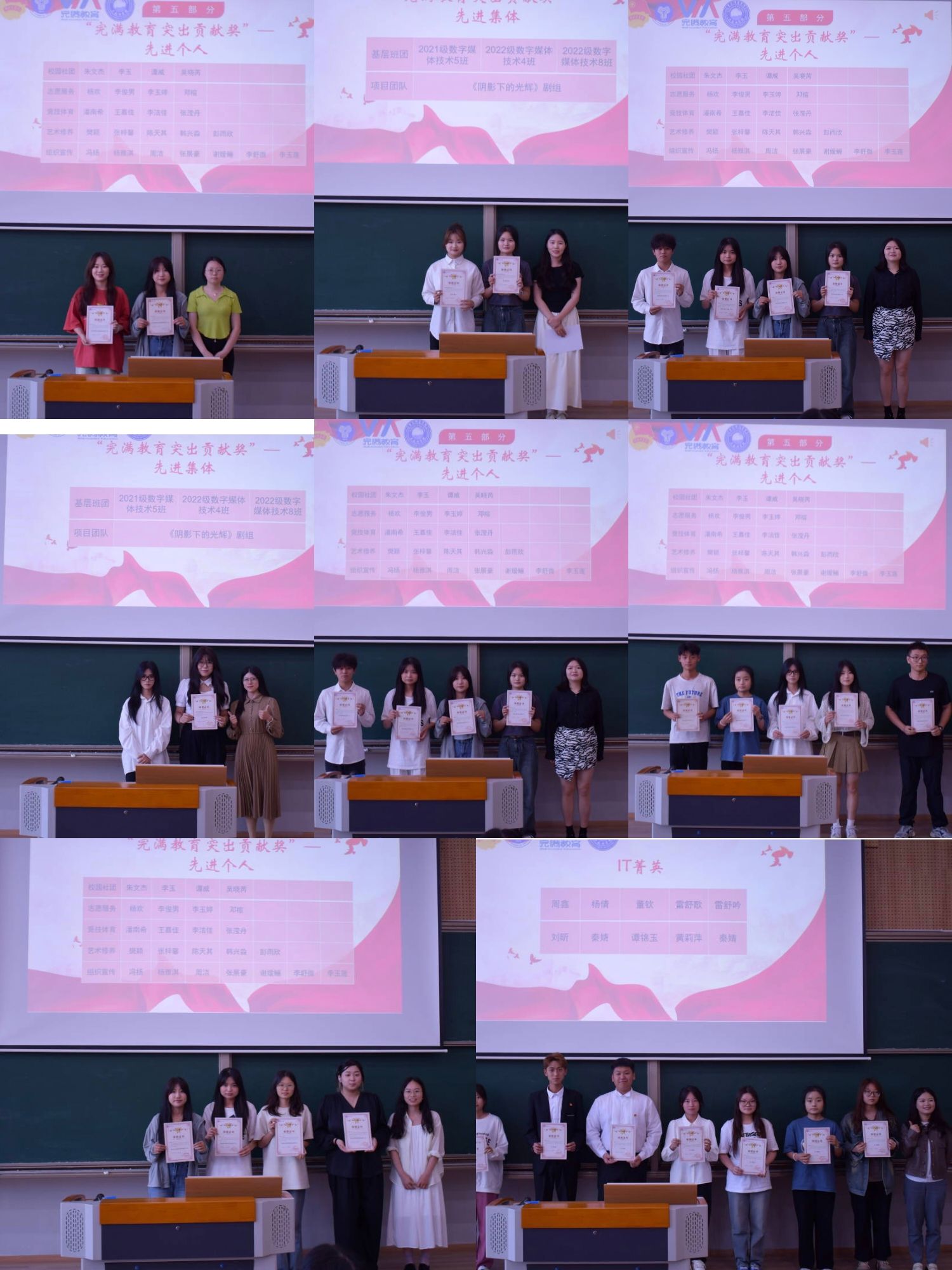 为树立和表彰一批优秀学生组织和优秀个人,发挥其在广大学生中的示范引领作用,号召向榜样看齐,向身边人看齐,述职结束后颁发了2023-2024学年大数据学院学生组织“优秀干事”荣誉证书。同时,团总支书记兰宇宣读《2023-2024学年大数据学院“完满教育突出贡献奖”》和《2023-2024学年大数据学院“IT菁英”》表彰文件,向朱文杰、《阴影下的光辉》剧组、2021级数字媒体技术5班等个人、项目和集体颁发了荣誉证书。
