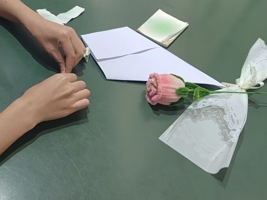 5月10日下午,这个温馨的母亲节主题活动正式拉开帷幕。我们首先在玉棠书院扎堆朋辈室开启了第一场活动,用圆珠笔、彩笔和贴纸,在信纸上用文字表达那些晦涩、不曾表达的爱意。紧接着,我们通过扔骰子的方式,选出了三名幸运儿与母亲打电话或视频进行小游戏互动,让他们随机抽取问题纸条,通过提问的方式增加彼此间的联结。此外,我们还准备了餐巾纸和A4纸,让大家可以通过视频教程学习制作不同类型的手工DIY花朵,作为母亲节的礼物。线下活动结束后,大家也将书写的信件和礼物都带回了家,并将礼物和真挚的祝福赠与了母亲。