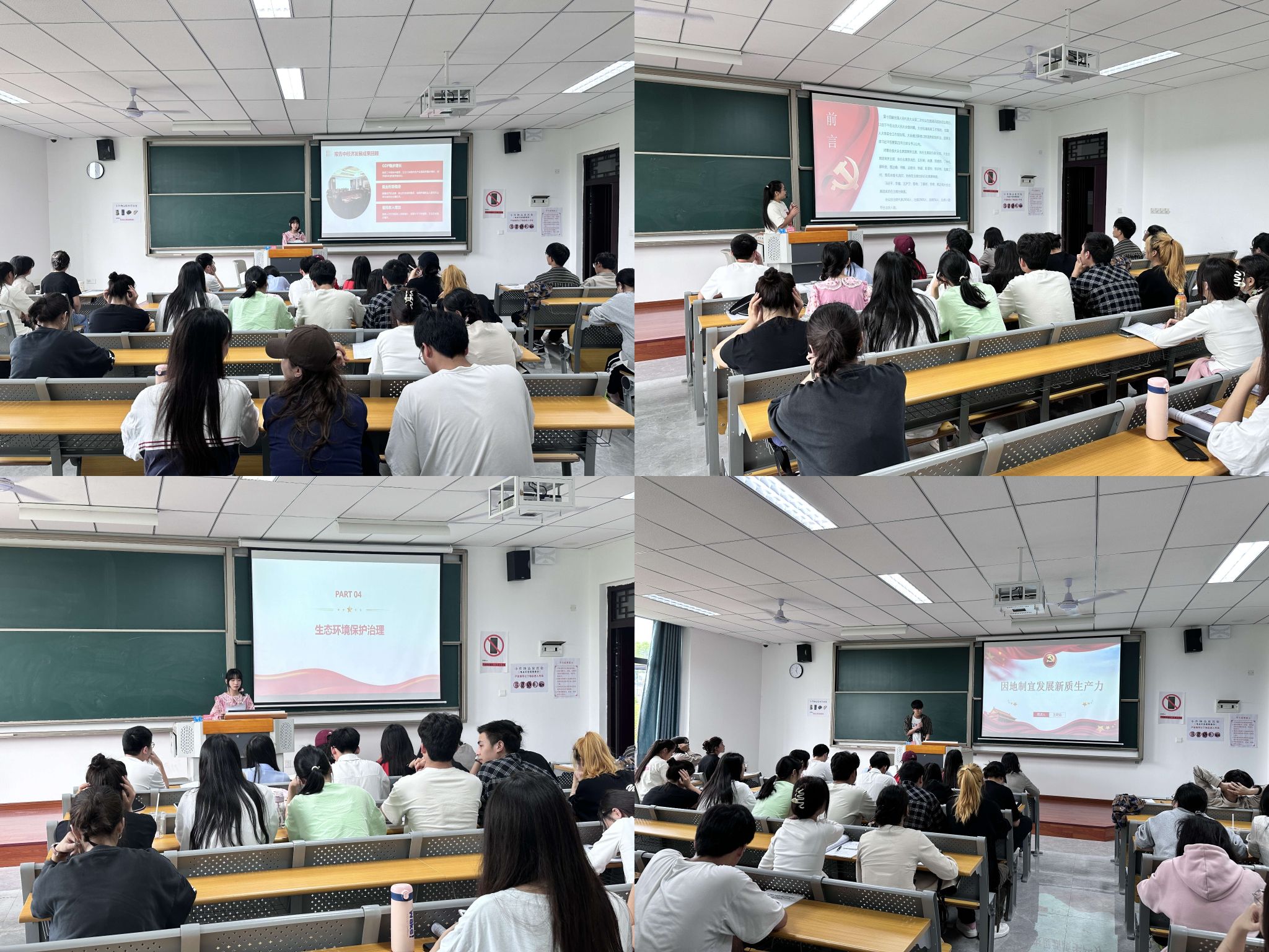 紧接着,由党员代表领学两会期间的重要会议、重要讲话、重要文件,结合自身理解与感悟,深入浅出地讲解了两会的主要内容和精神实质。龙金凤讲解了第十四届全国人民代表大会第二次会议闭幕会重要内容,阐述学习贯彻全国两会精神的重要意义,号召同志们必须牢记初心使命、顽强拼搏进取,奋力跑好历史的接力棒。张笳怡领学了全国政协十四届二次会议的内容,强调要提高政治站位,聚焦重点任务,坚持大团结大联合,推进中国式现代化。王荷锜重点讲解因地制宜发展新质生产力:因地制宜是发展新质生产力的前提;创新是发展新质生产力的核心;人才是发展新质生产力的关键;可持续发展是发展新质生产力的保障。陈正飞则分享了总书记在两会以上的精妙比喻,如“稻草人”强调要严明纪律,“盆景”强调扶贫要办实事,“绣花”强调城市管理要精细化、扶贫要精准等13个关键词。孙小含讲解了2024年两会政府工作报告,通过经济发展成果回顾、民生保障、政府自身建设、生态环境保护治理四个方面进行解读。