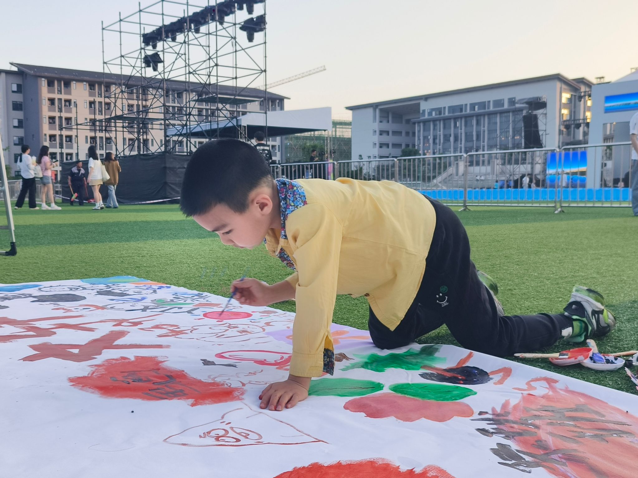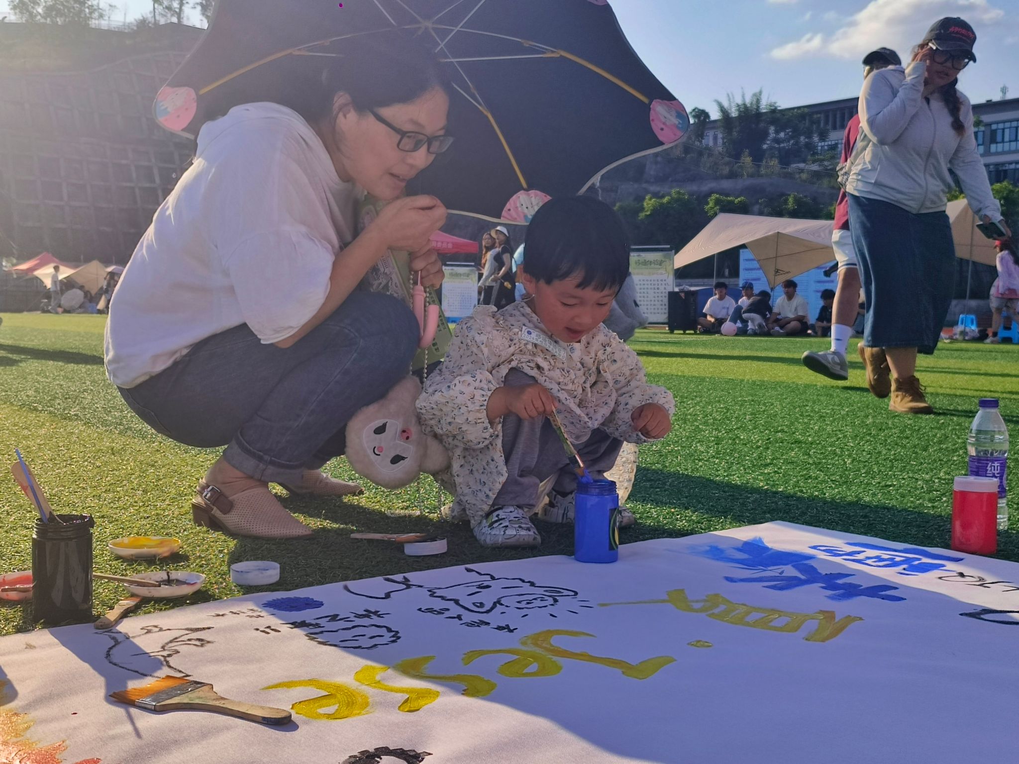 随着校园市民开放日展开,本次活动也迎来了众多游园亲子,校外师生。小朋友在家长的陪伴下,用自己天马行空的想象力描绘出童真童趣。家长在一旁鼓励指导,享受着惬意的亲子时光。校外师生们则一边用笔刷在画布上驰骋,一边听我们解答为什么移通会有这样有趣的活动。