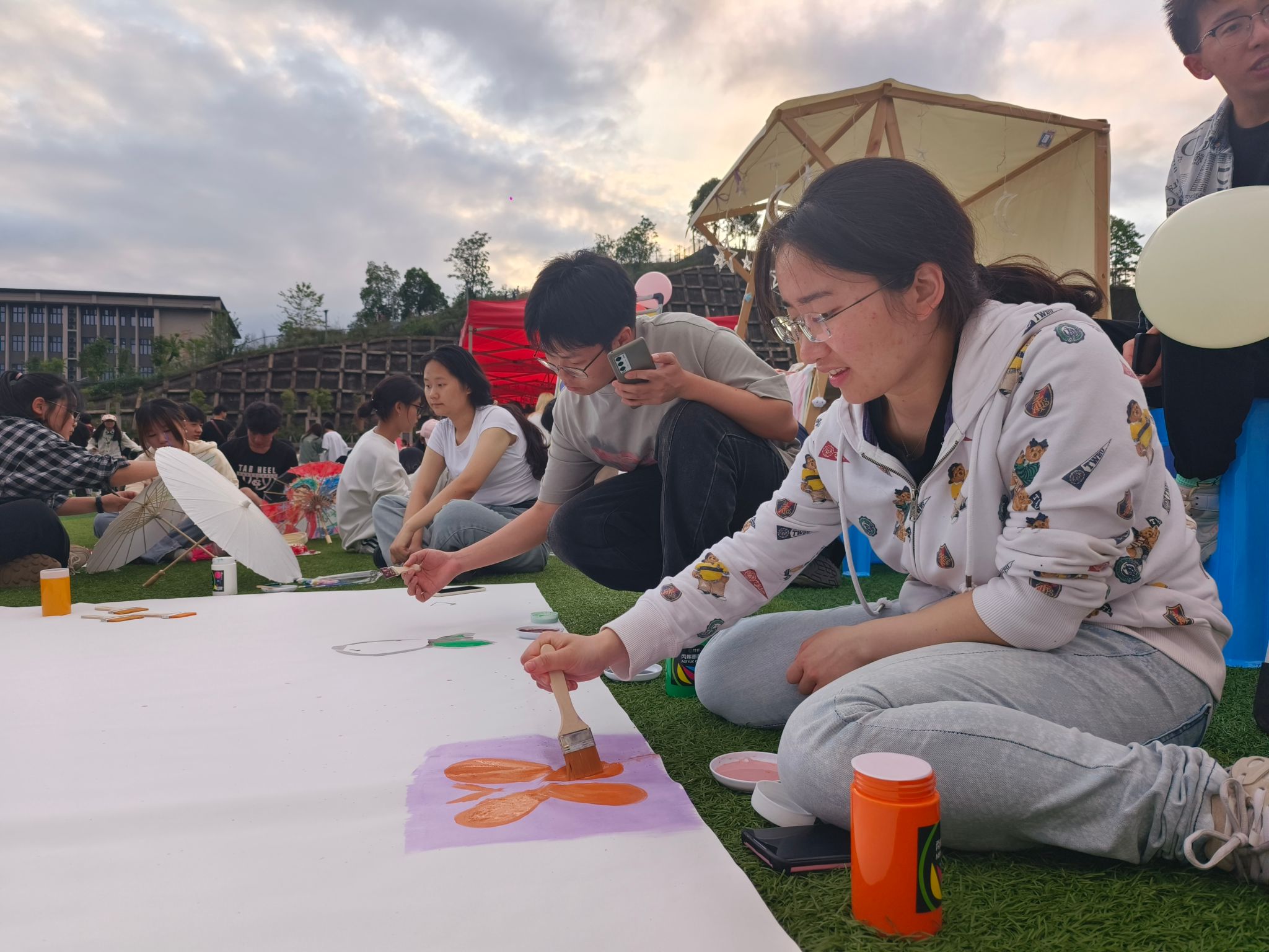 活动伊始,颜料未启,笔刷未动。阳光便先为展开的画布铺上名为“热情”的底色,吸引来往同学拿起笔刷,裹以颜料,辅以阳光,或描或画,用每一道笔触勾勒出自己的青春见闻,用每一滴颜料凝结出自己对戏剧的想象。