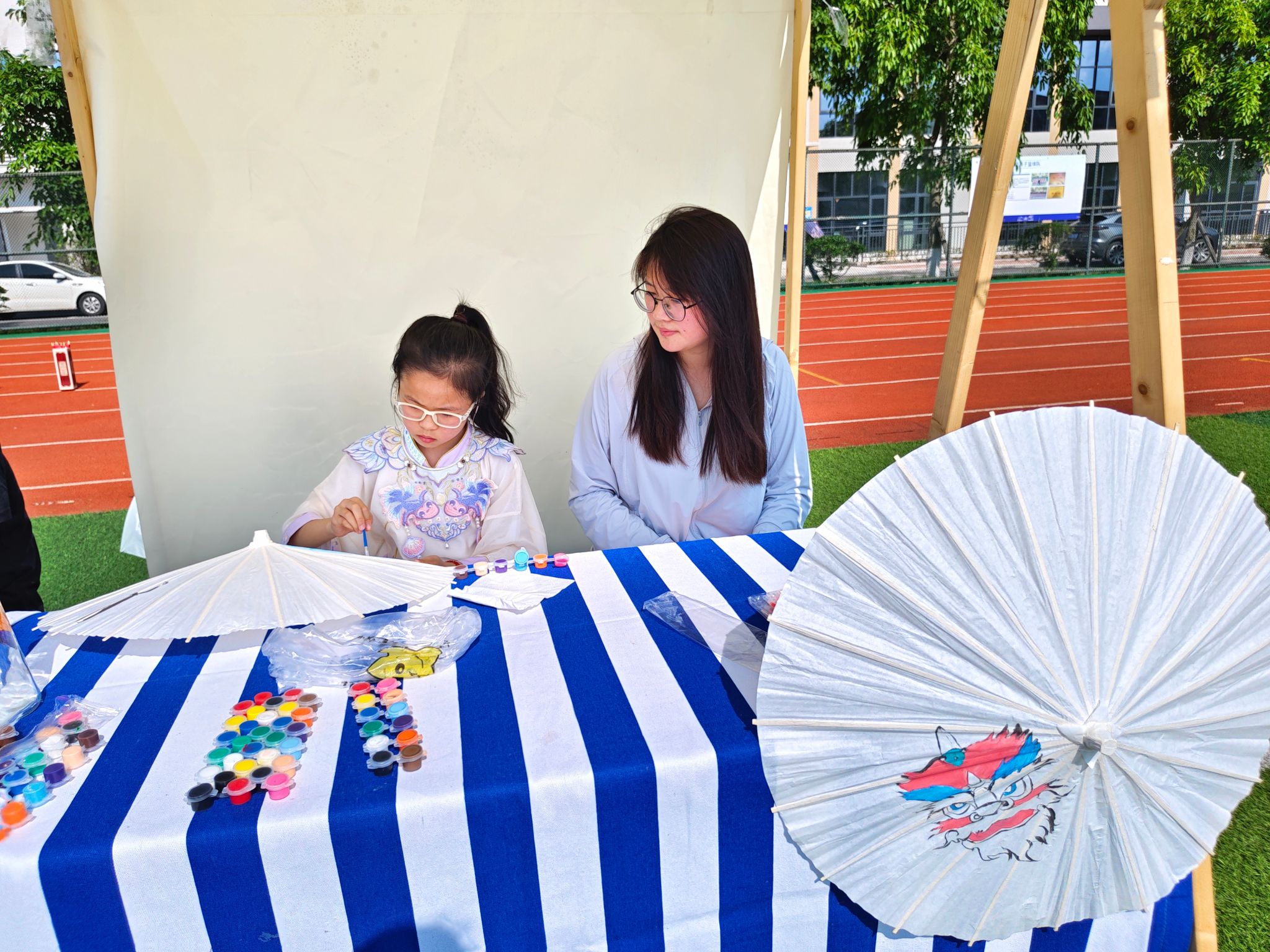 除了在校师生,活动也吸引了市民开放日的众多小朋友和家长们的参与。通过亲子互动,家长和孩子一起动手DIY油纸伞,共同体验非遗文化的魅力。小朋友在家长的陪伴下,认真描绘,每一笔都充满了童真与想象。家长则在一旁鼓励指导,享受着与孩子共同成长的快乐时光。这不仅增进了亲子间的感情,更让非遗文化在一个又一个的家庭中得到了弘扬。