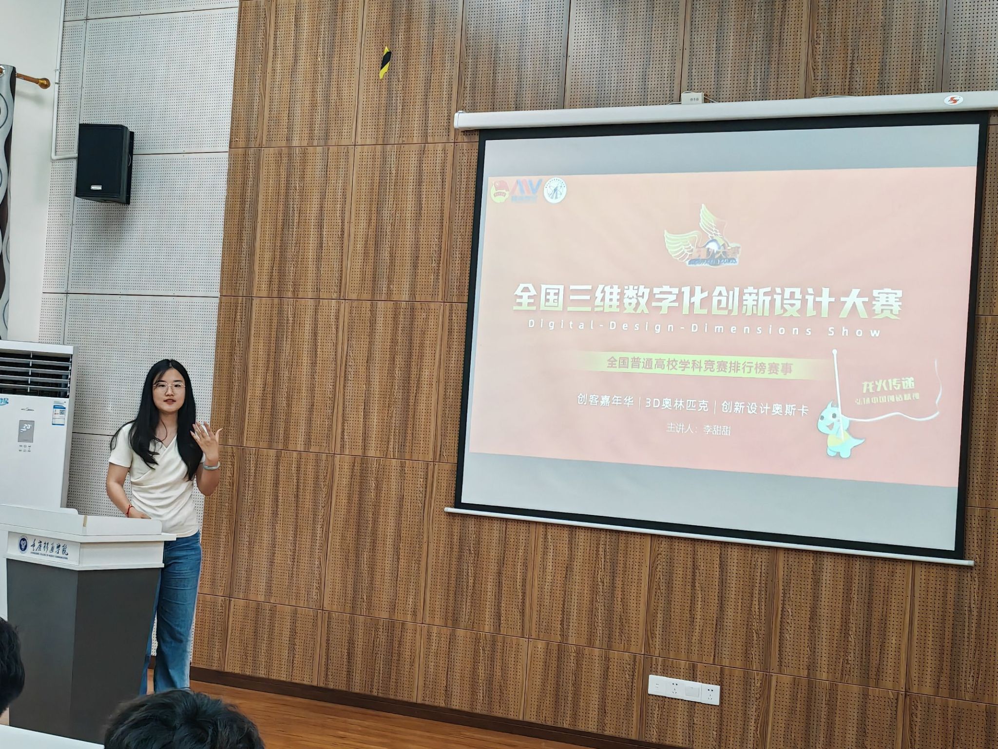 讲座开始,李甜甜同学从基础的概念讲起,详细地介绍了3D建模的基本流程和领域,简述了3D建模的独特之处和对自己的吸引力,对能够参与大赛表示兴奋和感激之情,分享了自己在创作过程中的付出和团队协作,表示了对3D建模大赛的热爱和继续探索的决心。
