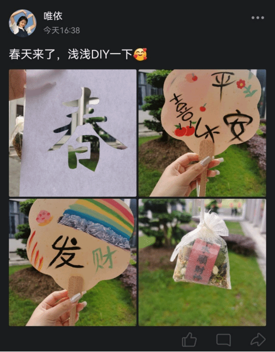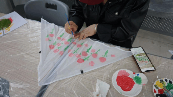 燕子来时新社,梨花落后清明。参与者在风筝DIY的过程中,将“春天”绘在自己的纸张或木扇上。此项活动不仅锻炼了参与者的动手能力,还利于他们发挥想象力的同时,接受传统文化的熏陶,培养对传统文化的热爱与尊重。