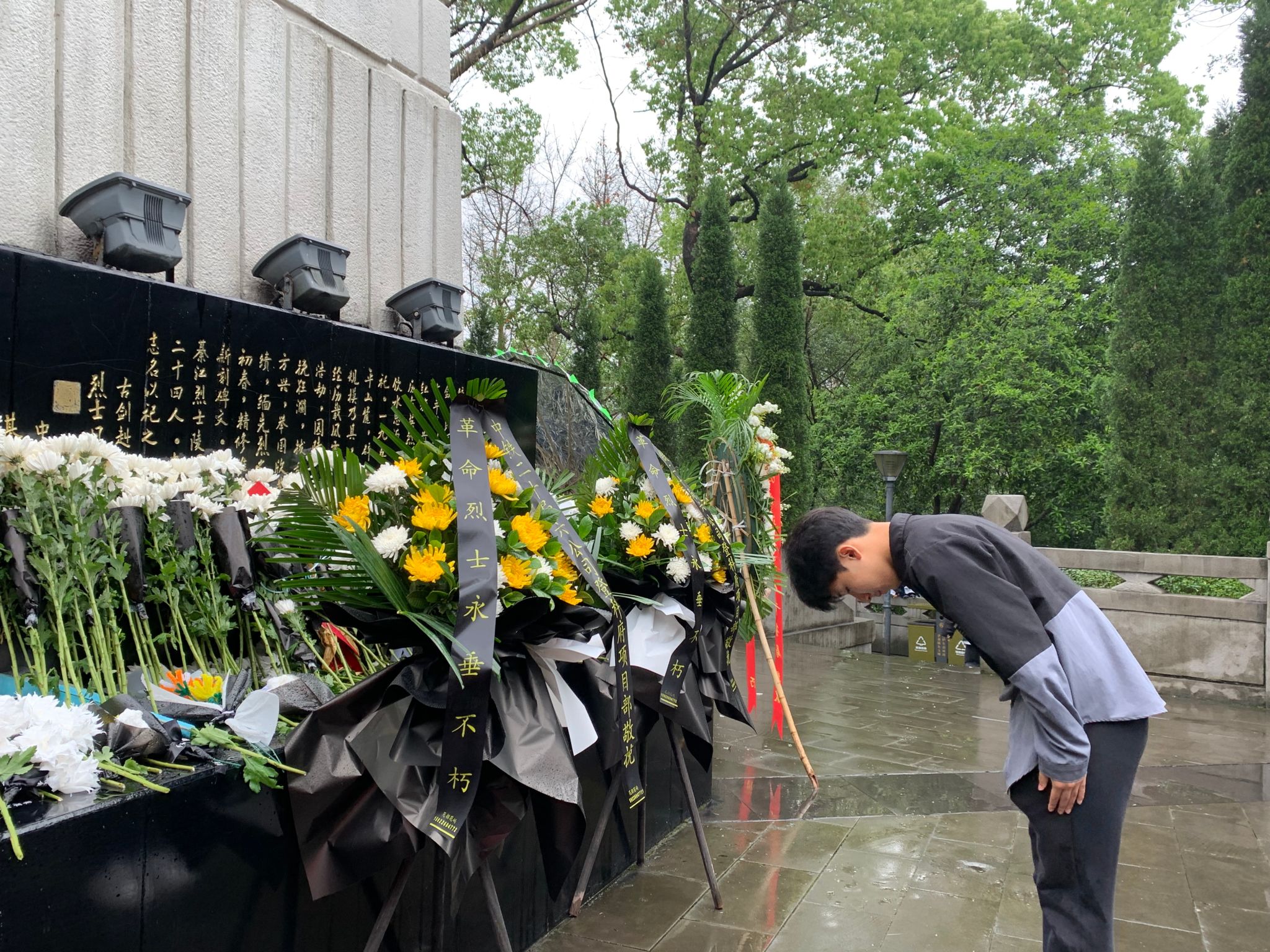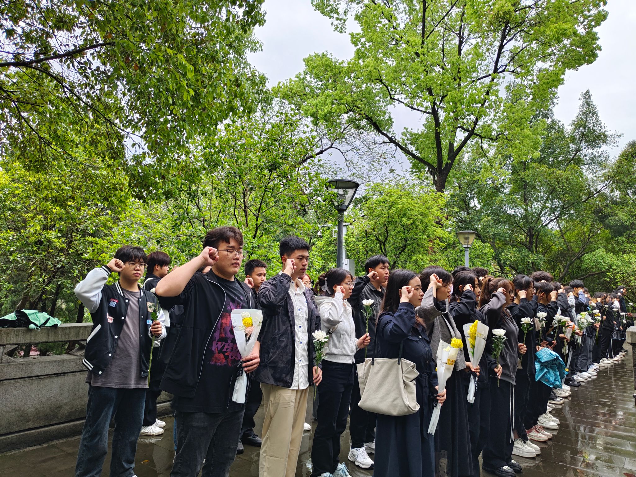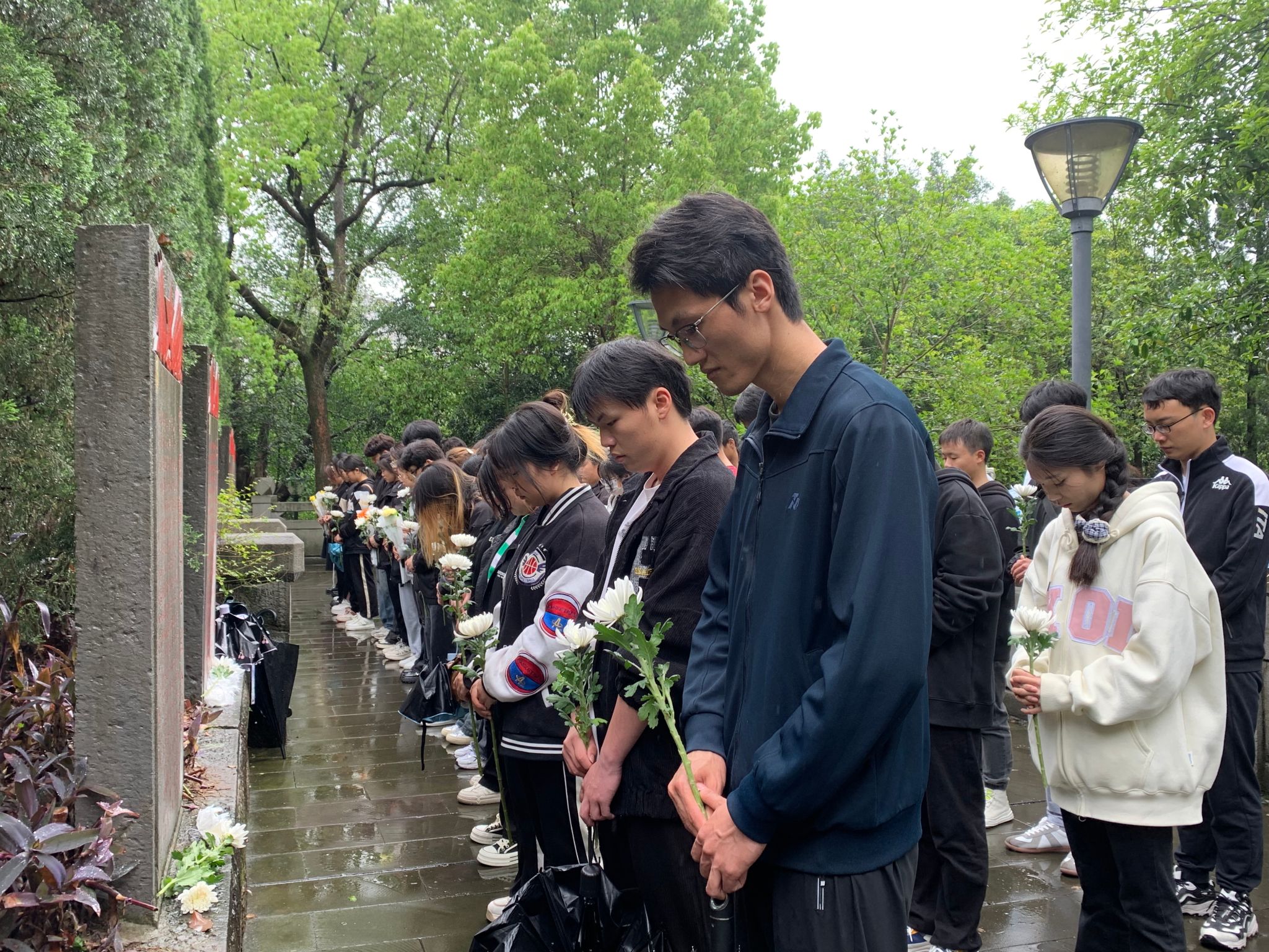 细雨如丝,学员们缓步至烈士纪念塔前,放下鲜花并鞠躬行礼,将美好与敬意献给革命先烈。每一朵花儿都承载着对英烈的思念与感恩,每一份虔诚都凝结着对和平与自由的向往。