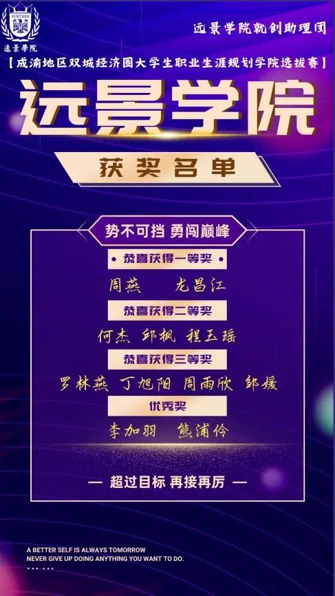 为贯彻落实党中央、国务院关于高校毕业生就业工作决策部署的具体举措,倡导大学生合理规划自身学业与职业发展,提高就业综合素质和实践能力,成渝地区双城经济圈大学生职业生涯规划大赛远景学院院选拔赛于2023年10月27日在花果书院功能室顺利开赛。本次比赛旨在培养学生的家国情怀和社会责任感。学院以大赛为契机,推动生涯发展教育工作的创新开展,以赛促学、以赛促教、以赛促就,紧扣大赛工作要求,以高标准落实好大赛的各项工作,将大赛打造成强化生涯教育的大课堂、促进人才供需对接的大平台、服务毕业生就业的大市场。大赛邀请了远景学院副院长李梦瑶、大数据与计算机学院就创办主任周义巧、数字信息学院就创办主任张婷、远景学院专业导师吴金燠、远景学院社团指导老师王语婷出席担任此次大赛的评委。