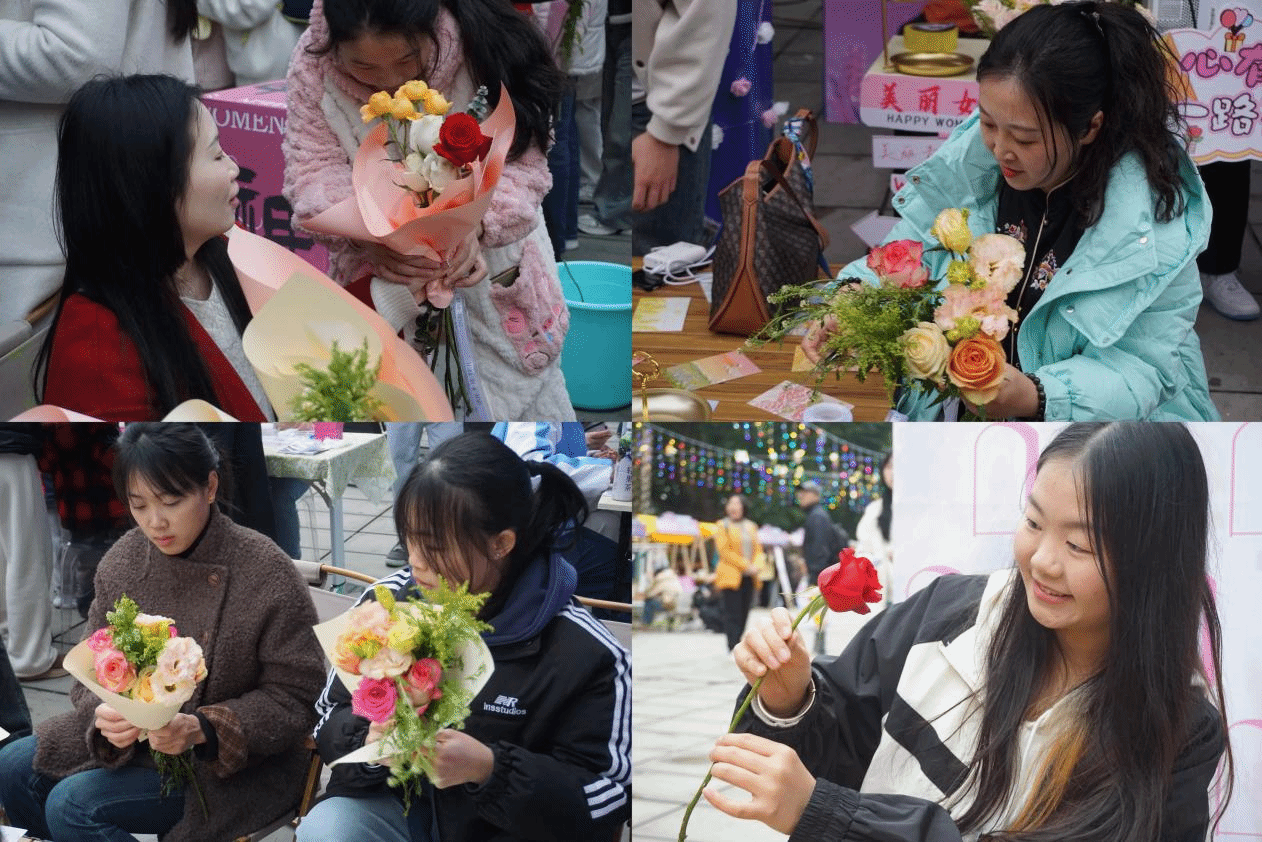 活动现场以藤蔓绿植为幕,将自然美学与人文创意巧妙融合。在 “花艺制作・心意 DIY” 区,同学们兴致勃勃,精心挑选玫瑰、满天星等花材,凭借奇思妙想搭配。大家一边动手,一边交流心得,现场气氛热烈。当附上写满真挚祝福 “花语卡片” 的花束被赠予师长好友,花香与情谊在校园里悄然流淌,让这个不同的一天充满了温馨与活力 。