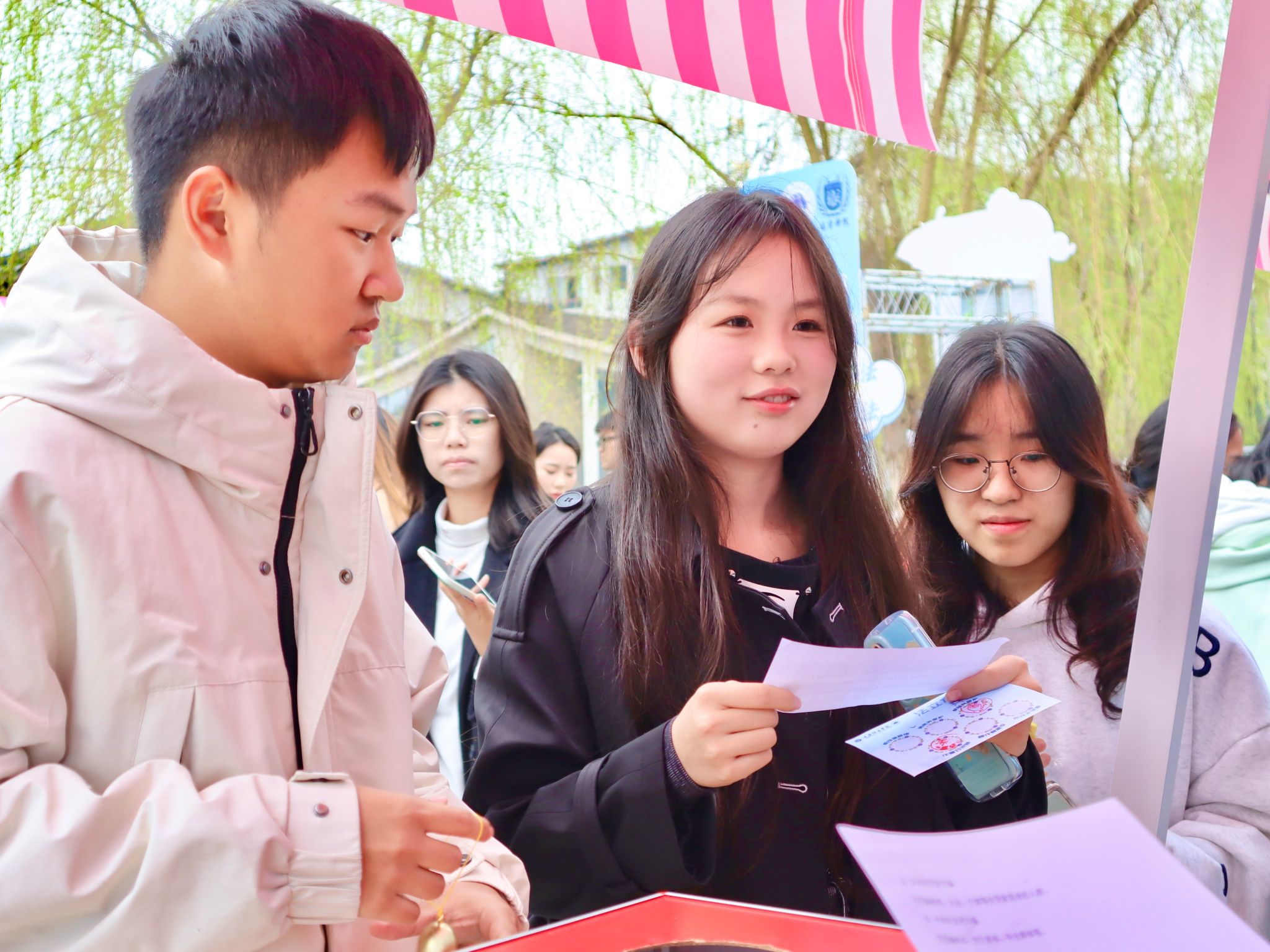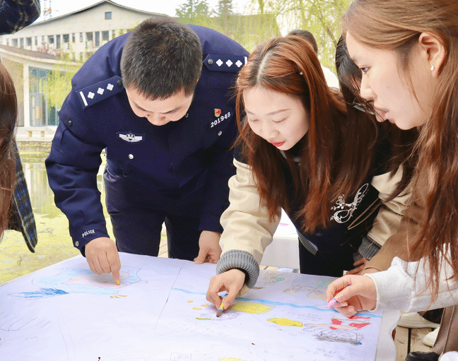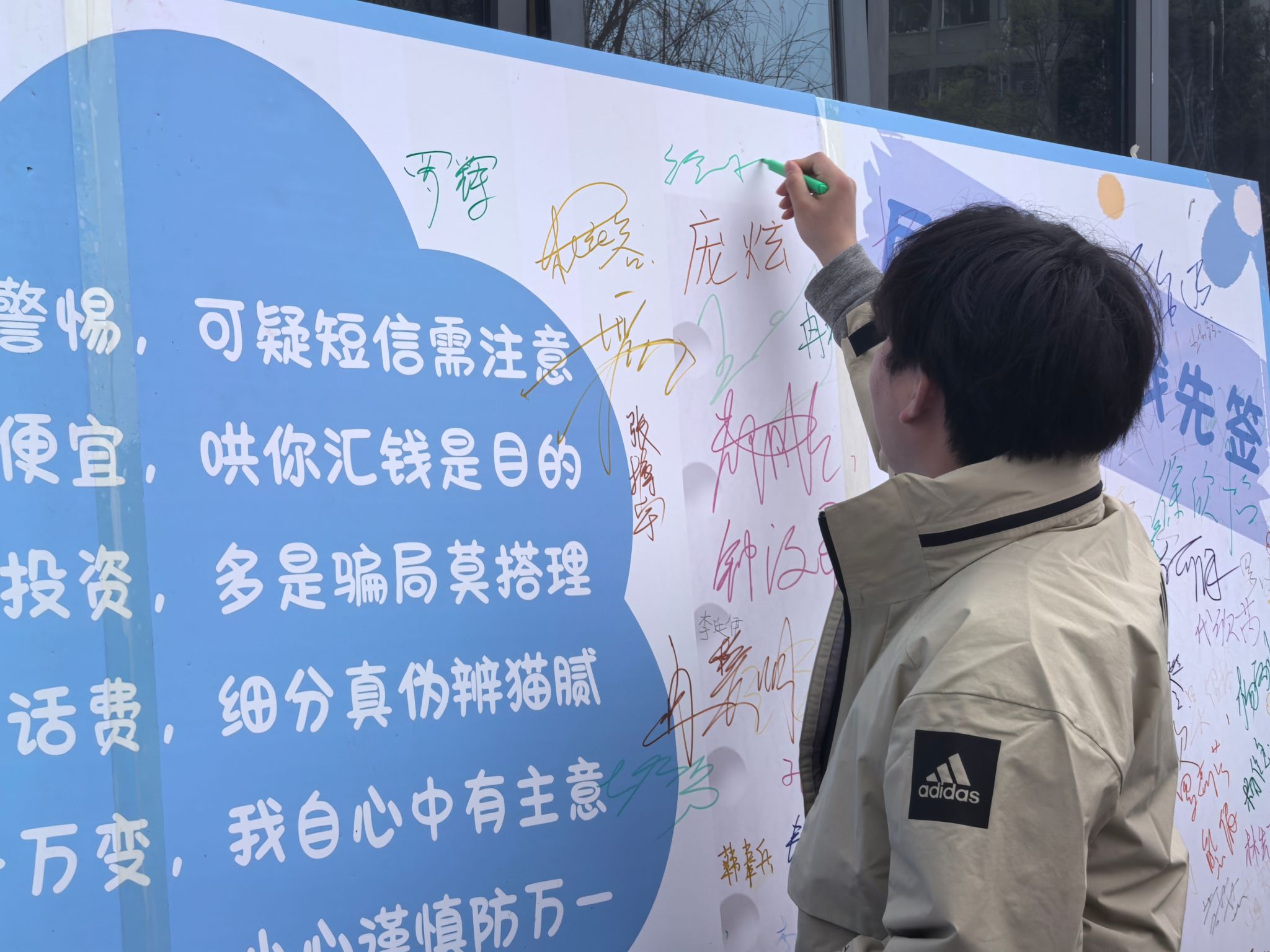 活动现场热闹非凡,多个精心布置的摊位有序排列,吸引着同学们参与其中。“知识寻宝活动”,同学们化身为求知若渴的探索者穿梭于天渠书院,仔细搜寻反诈知识卡片。寻宝过程中,他们不仅享受到了探索的乐趣,更在无形中加深了对各类诈骗手段的认识,掌握了更多实用的防范技巧。“反诈宣传海报创作”,同学们以色彩为笔,以创意为墨,将原本静默无声的黑白海报,赋予生动绚烂的生命力,使反诈知识以更加直观、吸引人的形式跃然于公众视野,成功引发广泛关注。