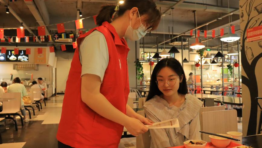 与此同时,在移通学院的各个食堂等人流密集区,志愿者们不断穿梭,向路过的学生们发放财税宣传手册,“同学,你好,本月是税法宣传月,这是我们为你准备的税收普法大礼包,里面记载了就业创业 ......”。
