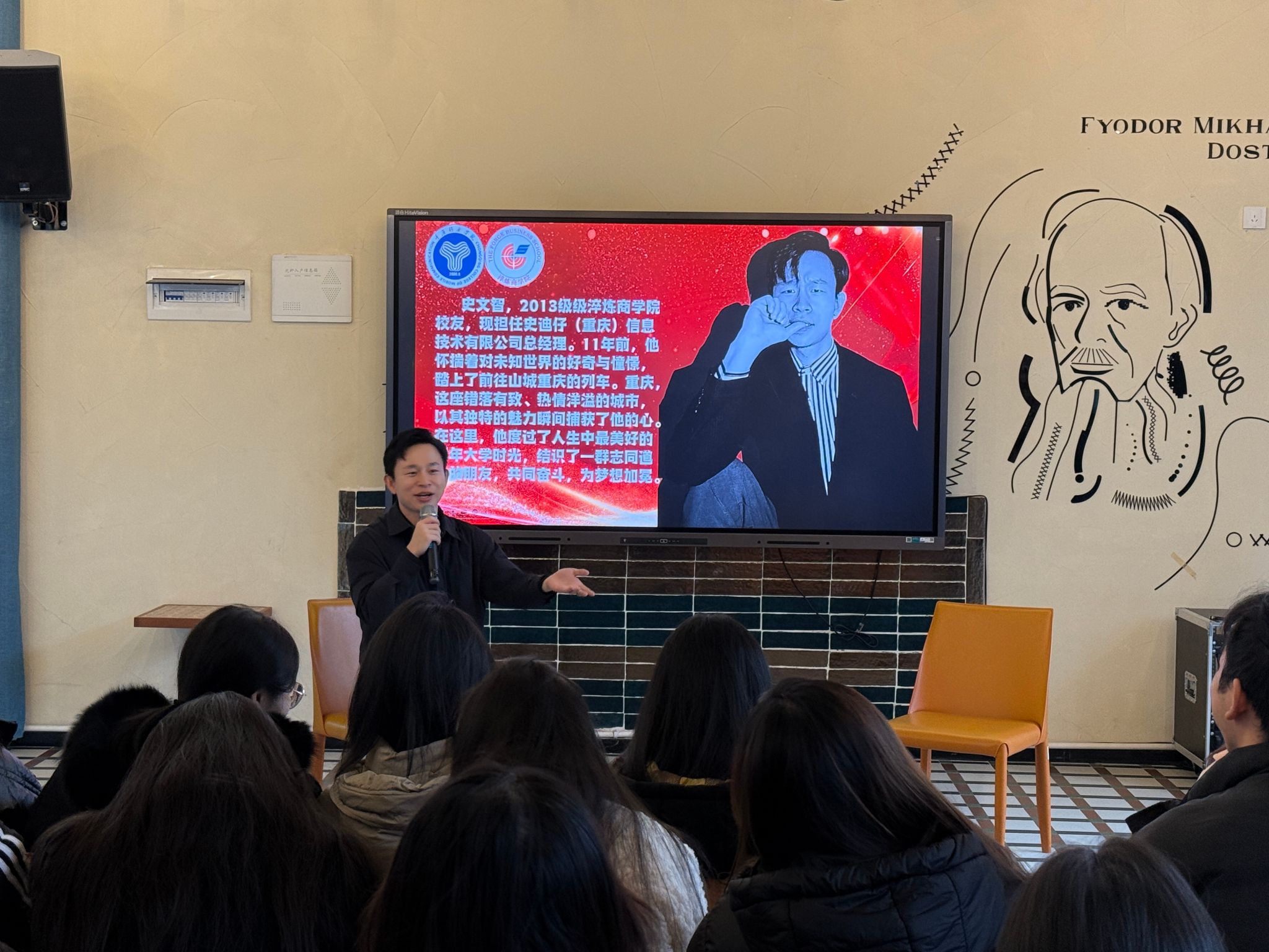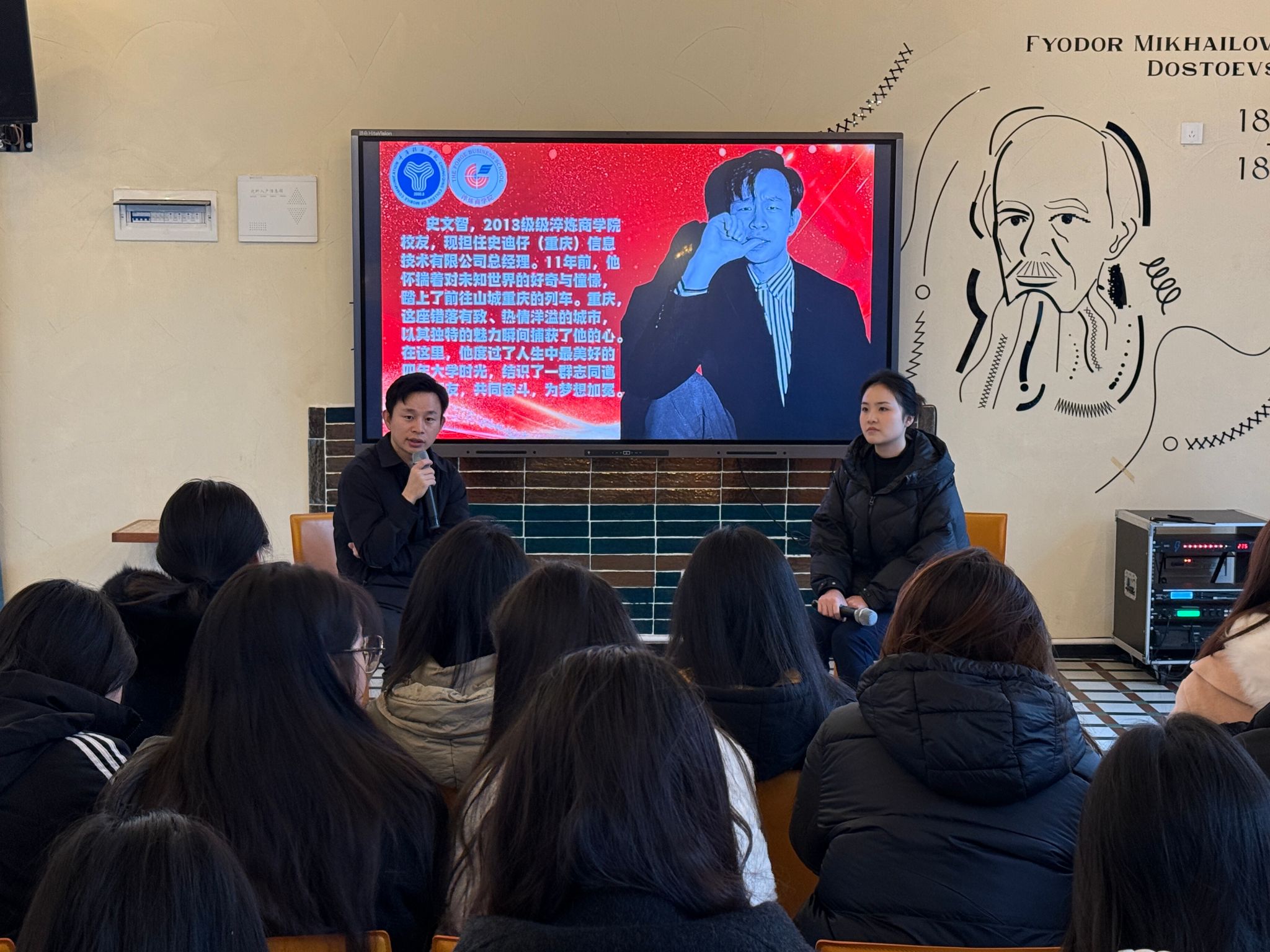 彼皆佼佼之材,汇聚则生蓬勃之力。为进一步强化校友与母校之间的深厚情谊,搭建起经验传承与交流合作的桥梁,淬炼商学院就业助理团于2024年12月13日在天空书院陀思妥耶夫斯基书店举办了“回忆往昔·展望未来——淬炼商学院2024-2025学年第173期校友主题活动”。本次活动有幸邀请到了淬炼商学院2013级校友史迪仔(重庆)信息技术有限公司总经理史文智学长与张琳莉老师一同以问答形式为同学们带来了精彩的分享、答疑解惑。
