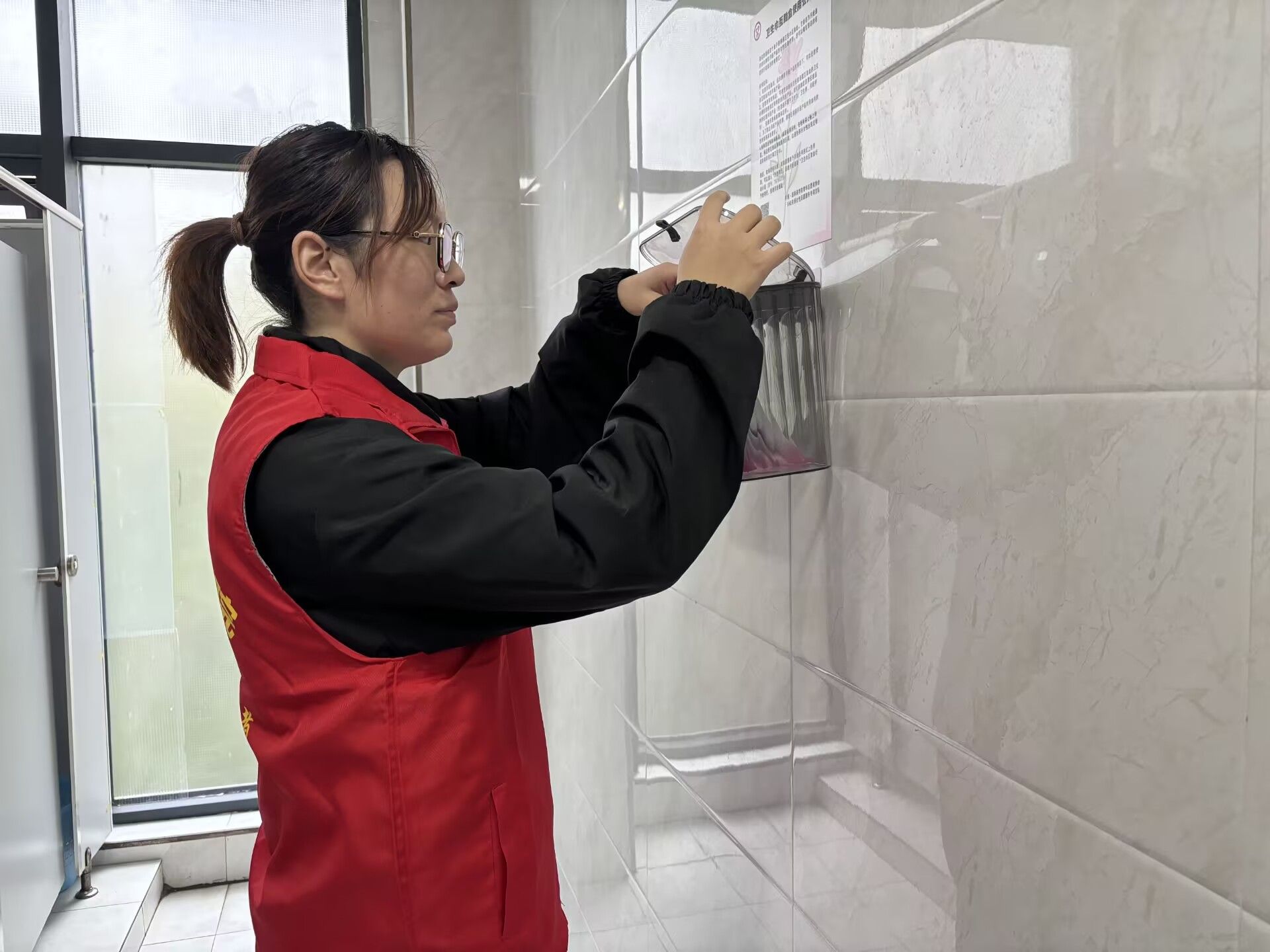 每个小组的志愿者们来到各自负责的楼层后,首先对互助盒外盒的灰尘进行擦拭,然后查看互助盒内卫生巾的使用情况。最后,志愿者们在对互助盒进行消毒清洁后,志愿者们把准备好的卫生巾依次放入互助盒内,确保卫生巾干净卫生且方便女生们取用。