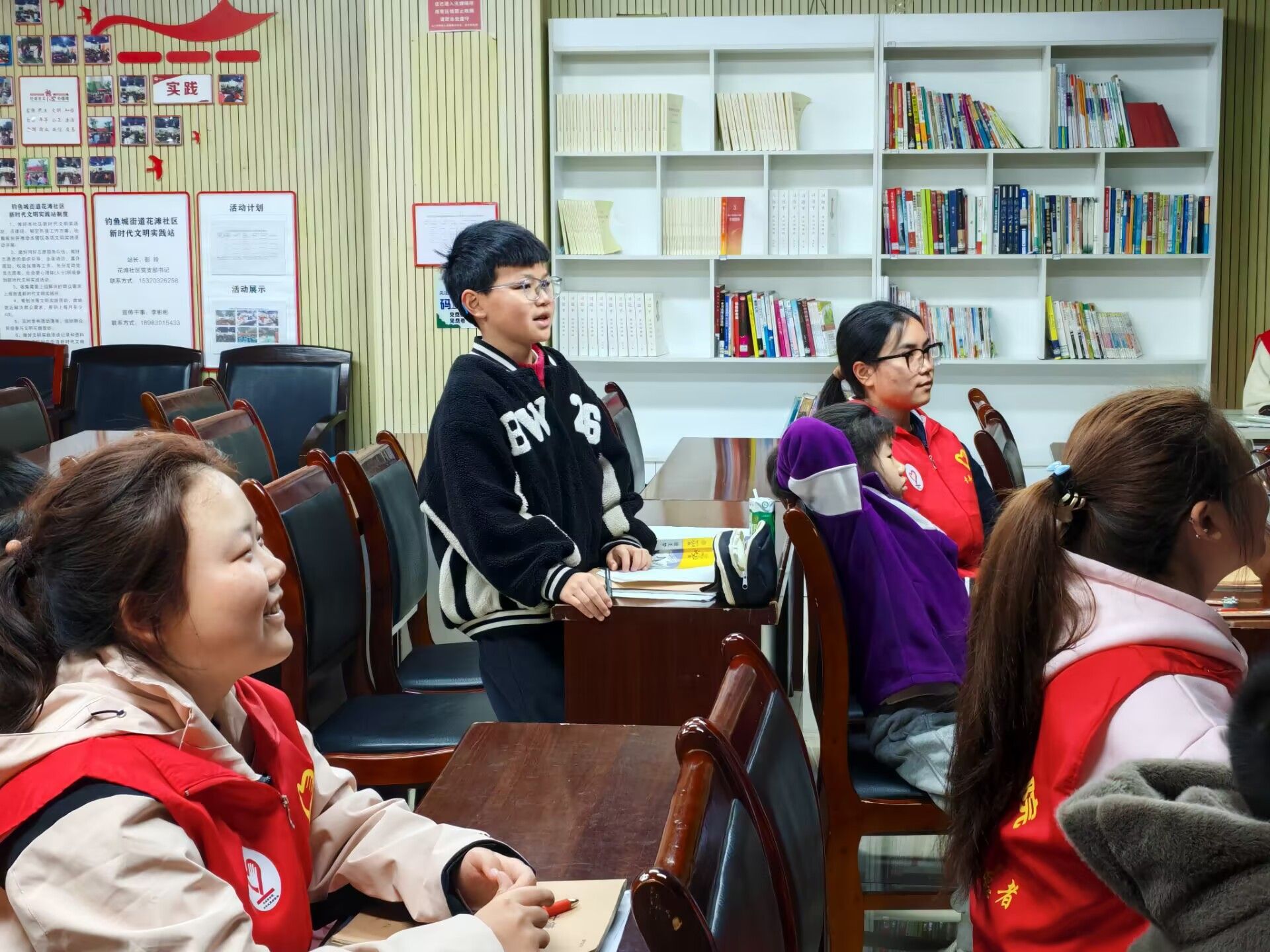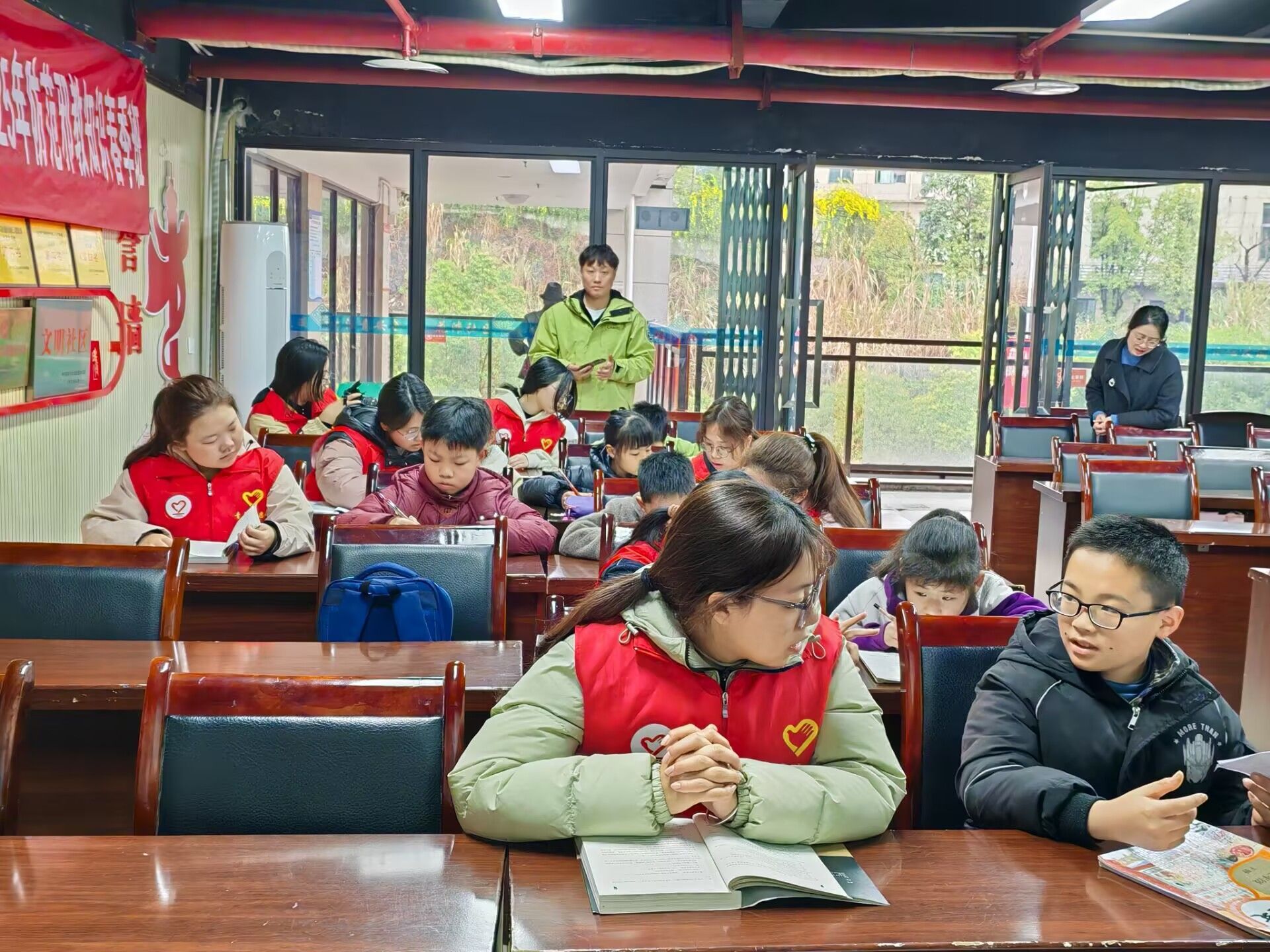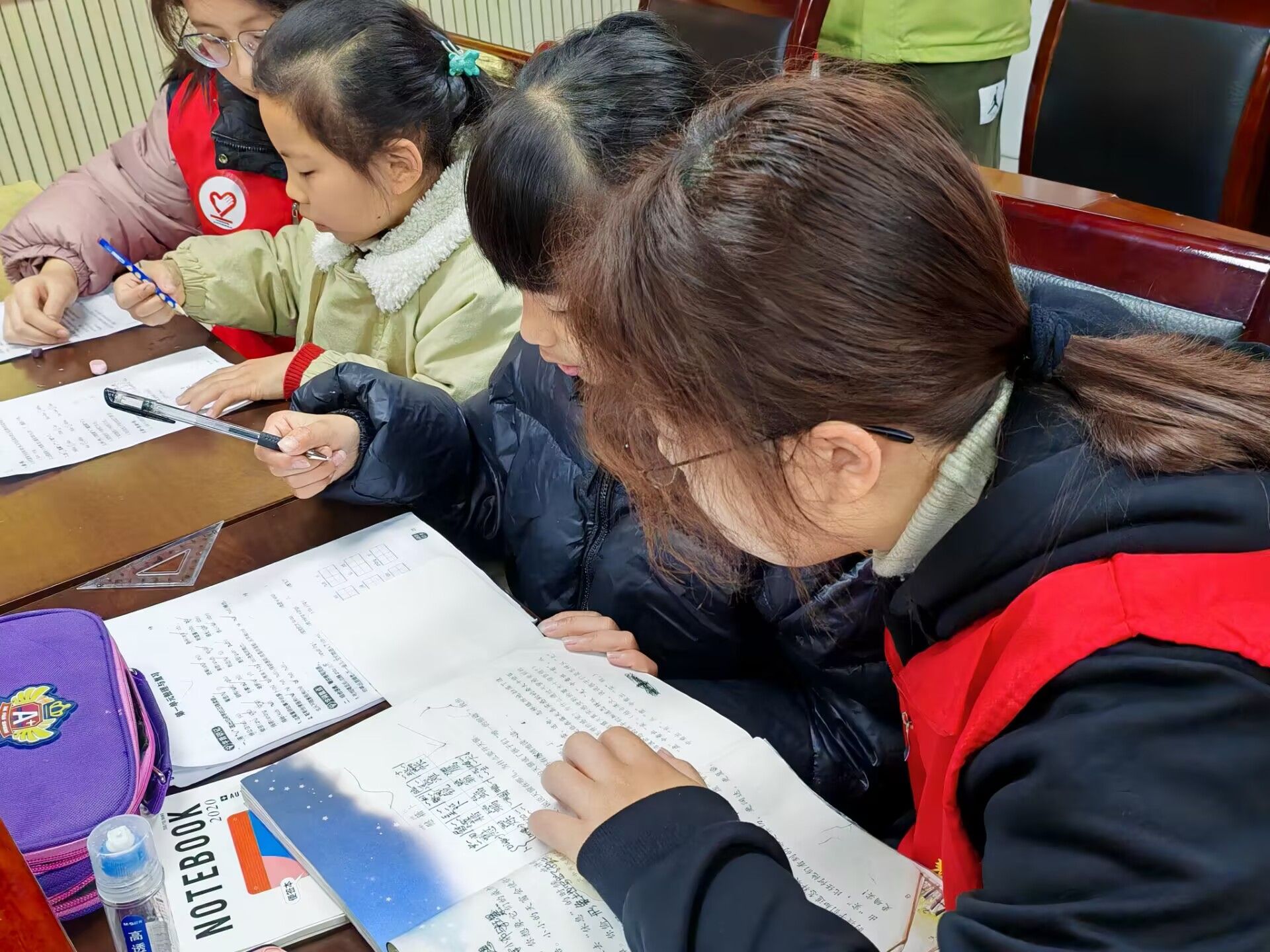 在植物科普过后,活动进入作业辅导阶段,志愿者们耐心十足地为孩子们辅导作业面对孩子们作业中的难题,他们或是轻声引导启发思路,或是细致讲解解题步骤,用十足的耐心和专业知识帮助小朋友们攻克一道道难关。遇到理解较慢的孩子,志愿者会反复举例,直至孩子完全掌握。