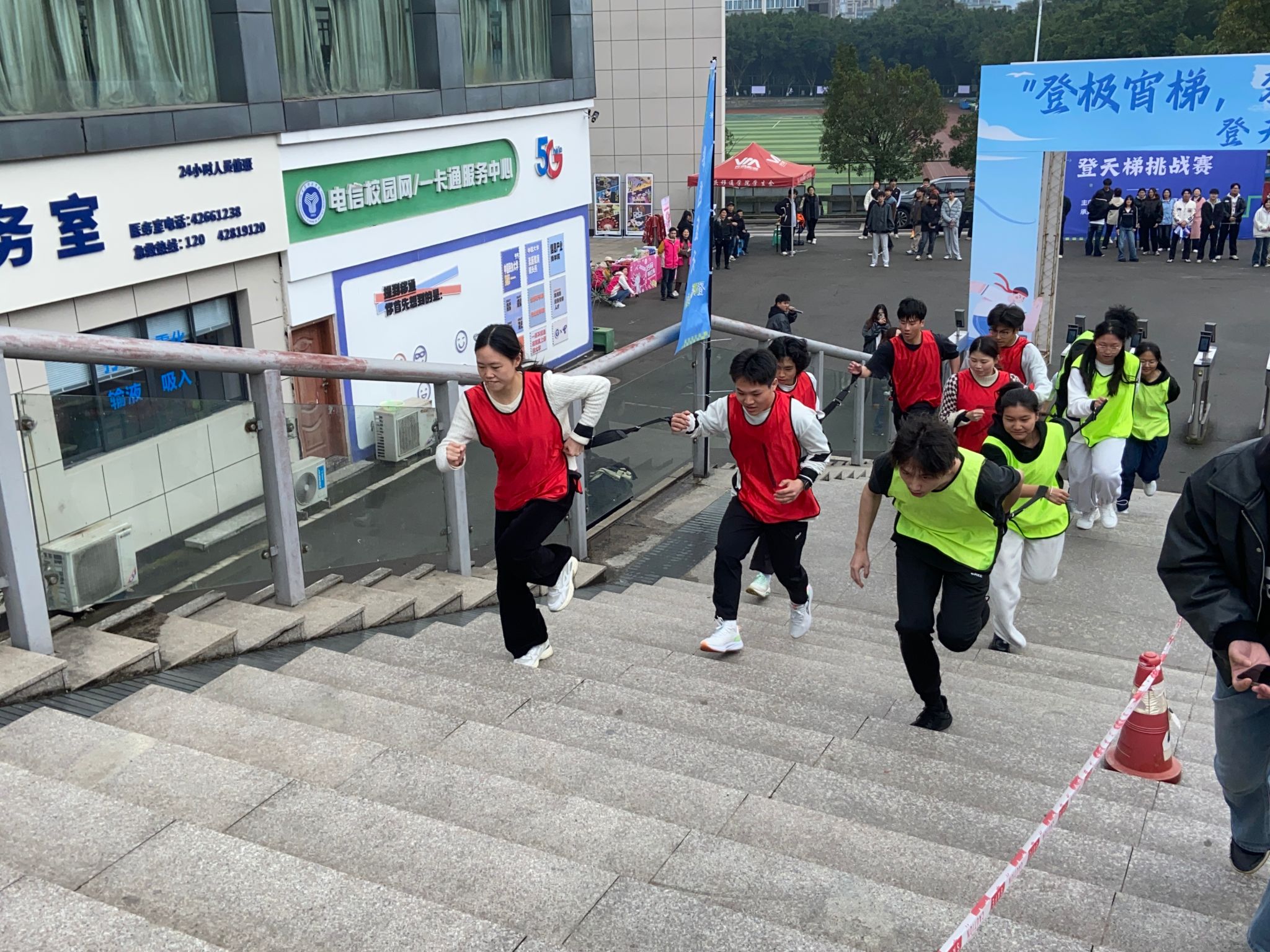 本次登梯赛以“趣味”为主题,旨在让师生们在运动中收获快乐,在挑战中超越自我。比赛设置了多个项目,既考验了选手们的速度和耐力,也考验了他们的团队协作能力和应变能力。天梯之上,他们或稳健前行,或奋勇攀登,每一个动作都展现出青春的活力与力量。尽管过程中不乏艰难与挑战,但参赛团队始终保持着坚定的信念和不懈的努力,他们的身影在天梯上划过一道道勇敢的轨迹。校园内外,加油声、呐喊声此起彼伏,形成了一片热烈的海洋。观赛同学组成了啦啦队,他们手持加油牌,用最真挚的话语为参赛学生们鼓劲加油。每当有学生成功登顶或突破自我时,现场便会响起雷鸣般的掌声和欢呼声,那份激动与喜悦仿佛能够穿越天际。