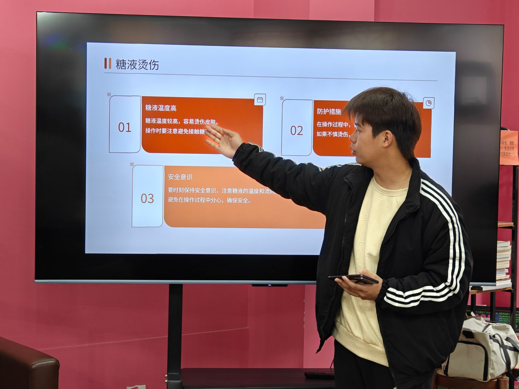 活动伊始,主持人陈星东以图文并茂的形式,向同学们详细介绍了糖画的历史渊源、发展历程以及制作工艺。糖画,起源于宋代,距今已有千年历史,是我国传统民间艺术的重要组成部分。以糖为墨,以勺为笔,通过手艺人娴熟的技艺,勾勒出各种栩栩如生的图案,既可观赏又可食用,深受人们喜爱。