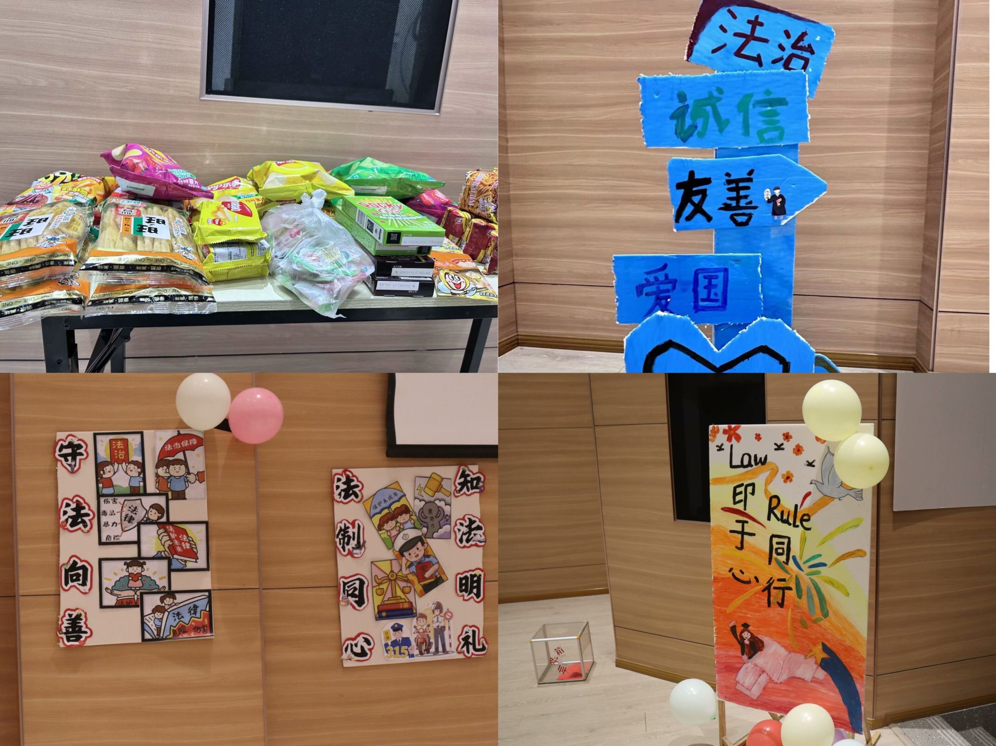 活动伊始,入口处的规则文化展示区吸引了众多学生的目光。展示区摆放着写有法律条文和法律故事摘要的卡片,学生们随机抽取一张卡片阅读,并在特制的签到墙上留下自己对规则理解的一句话。完成这一环节的学生即可获得“规则能量值”,用于后续兑换小礼品。这一设计不仅让学生初步接触规则相关内容,更激发了他们对活动的兴趣,为整场活动营造了浓厚的氛围。