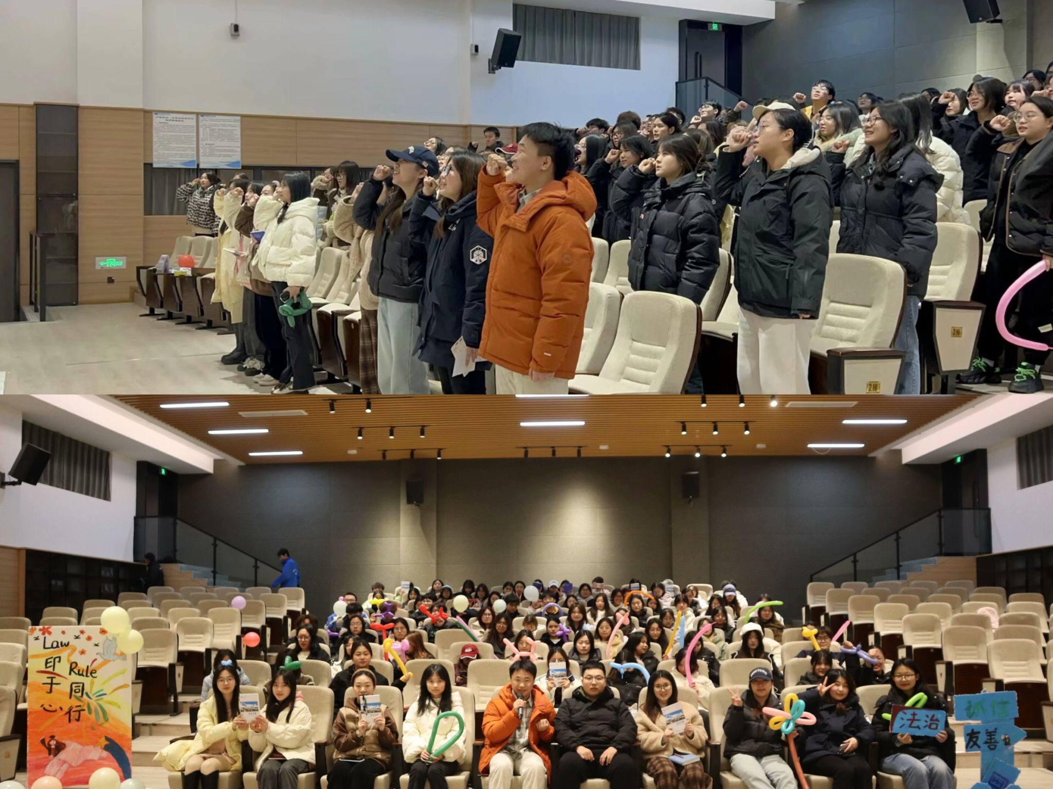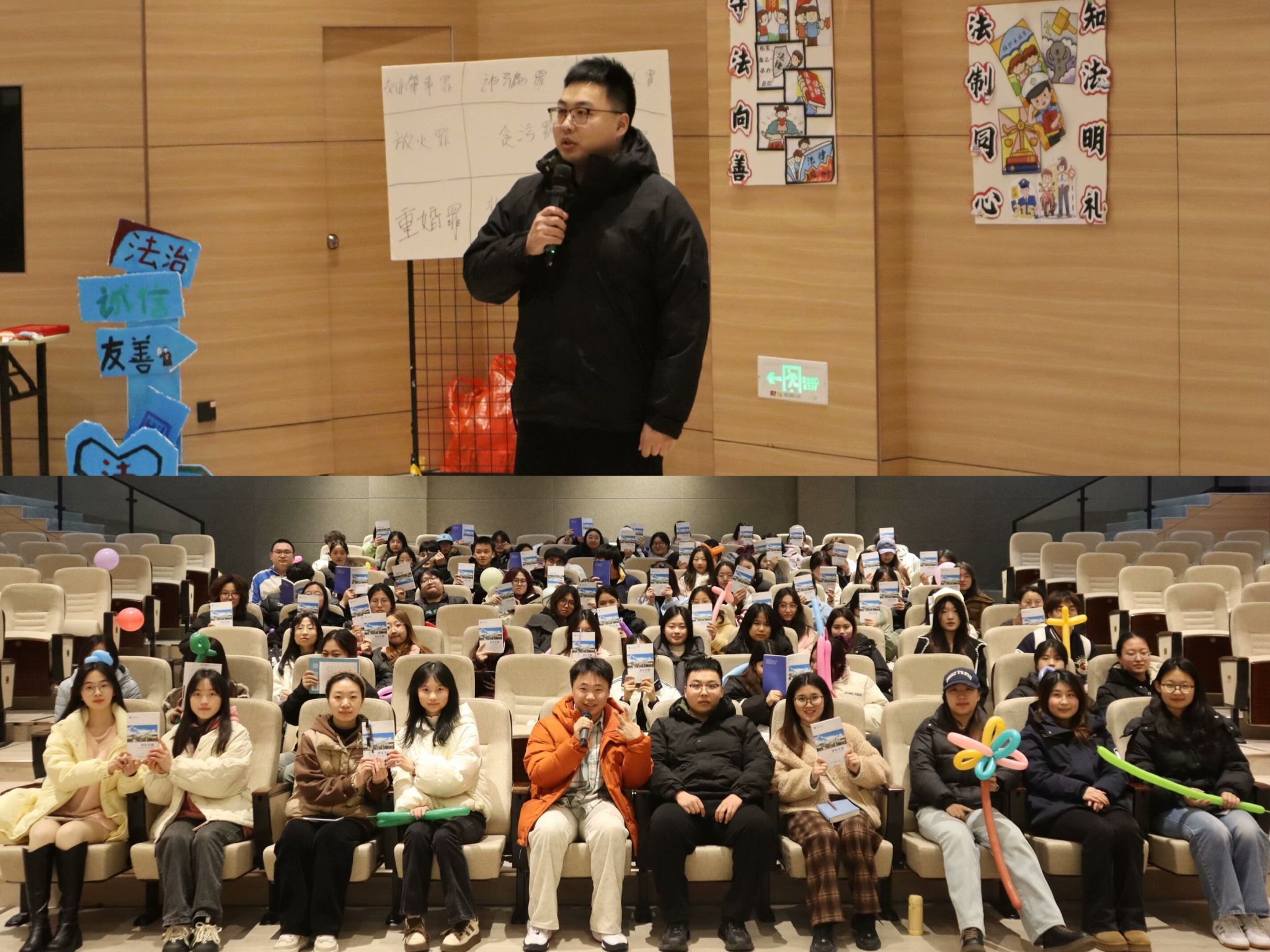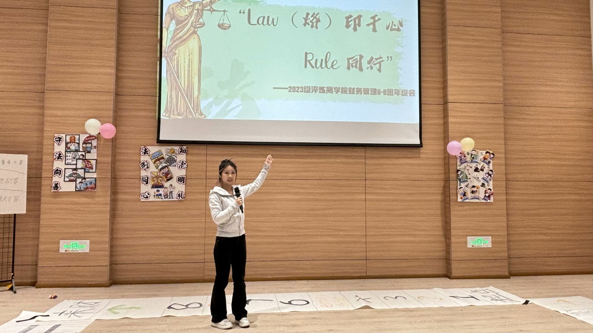 为助力学生深入研读学校规章制度,把握行为规范,了解社会法律法规框架,构建系统的法制规则知识体系。2023级淬炼商学院财务管理6—8班于2025年3月18日晚上19:00在六度空间创梦空间举办了以“Law(烙)印于心·rule同行”为主题的年级会。本次活动通过丰富多彩的形式,引导学生将规则知识内化于心、外化于行,在学习中严守纪律、诚信考试,在校园生活中爱护财物、文明交往,为学生步入社会自觉守法、践行公序良俗筑牢基础,助力其成长为有担当、守规矩的新时代青年。