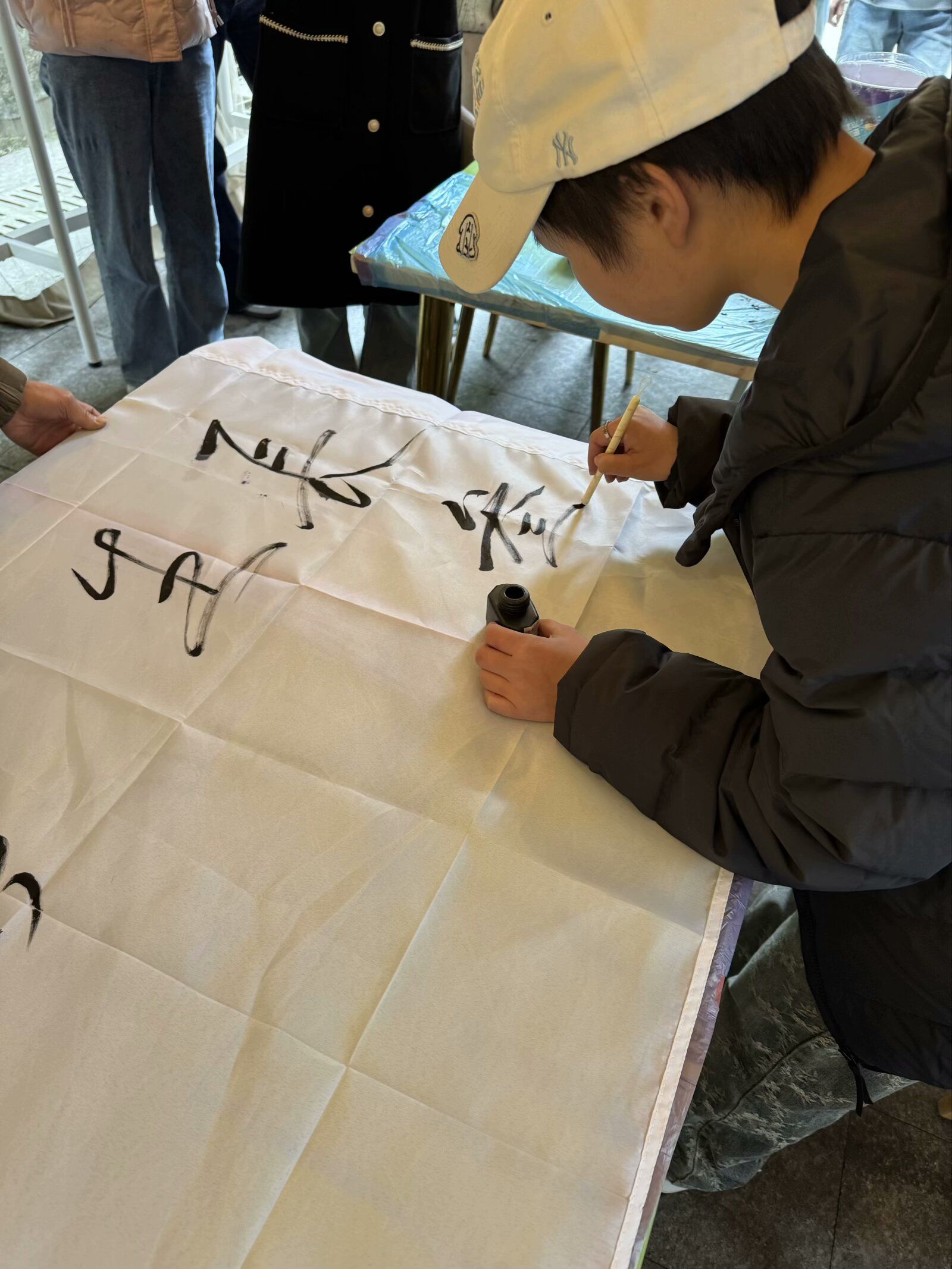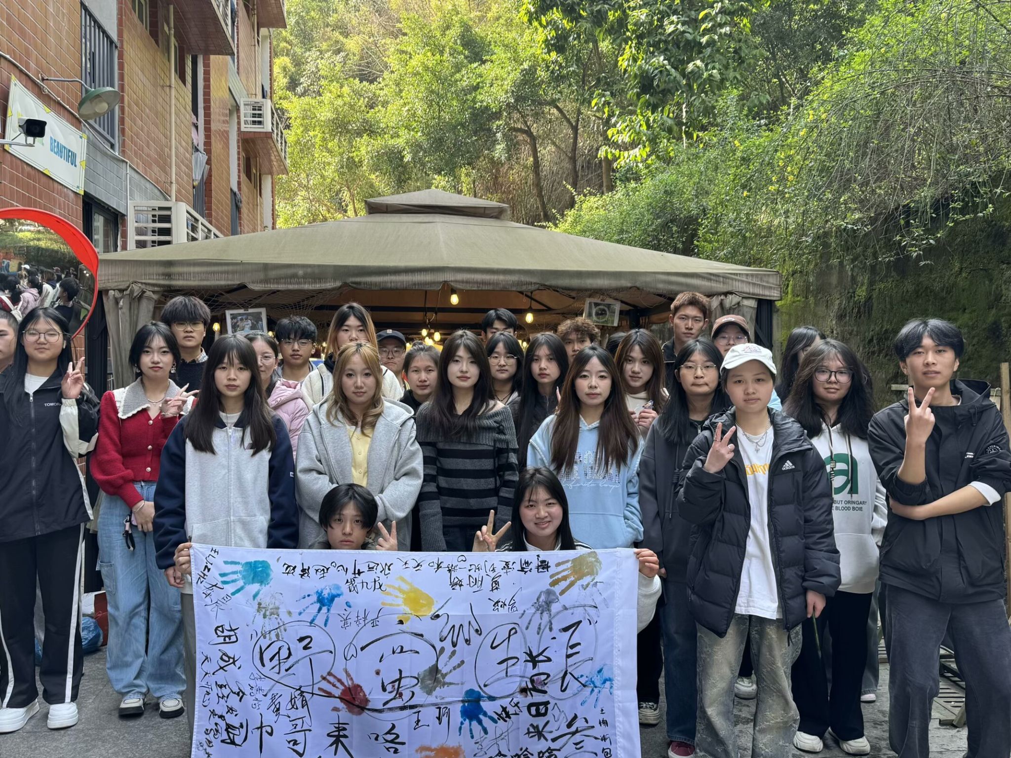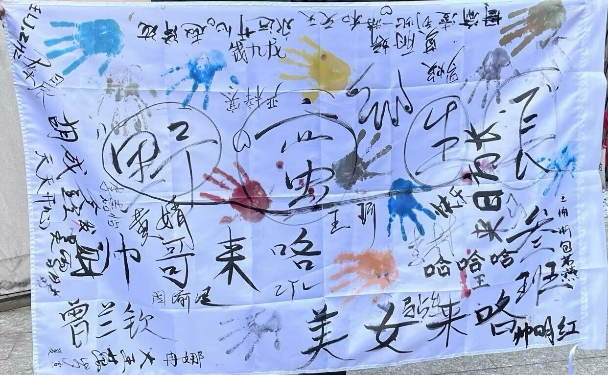 墨水制作的余温尚未散去,精彩纷呈的“绘制蓝图”环节随即张开。大家齐聚大幕布前,共同“绘制三班蓝图”。贾滟同学走向前,神情专注而坚定,紧接着手中毛笔饱蘸浓墨,笔走龙蛇间,“野蛮生长”四字随之呈现。这四个字不仅是一种信念,更寓意着同学们在未来的人生里永远保持积极向上的姿态,自由生长。随后大家纷纷用文字倾诉心声,用手印留下独特印记,将自己对班级的热爱定格在这一方幕布之上。最后,全班同学在镜头的聚焦下留下了一张独特的合照,为此次活动画上了一个韵味悠长的句号。