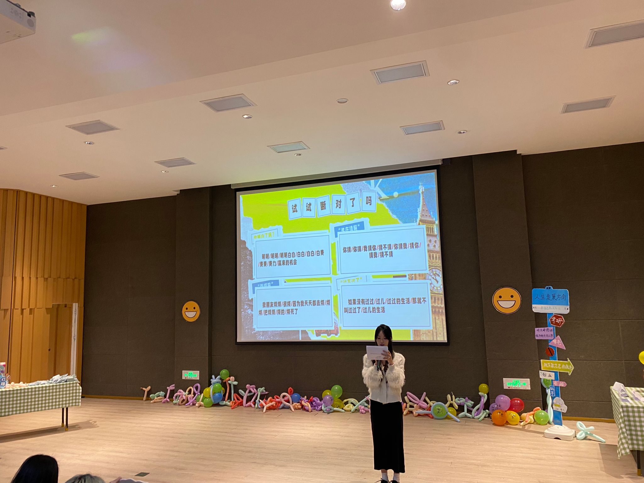 活动伊始,一场充满趣味的“错误乘法口诀”破冰游戏瞬间点燃了现场气氛。同学们在断句挑战和欢乐互动中分享各自的求职故事,欢笑与交流不断。大屏幕上循环播放的求职主题短视频,配合抽奖号码牌的发放,使求职知识在轻松愉快的氛围中悄然传递,为同学们埋下了求职的种子。