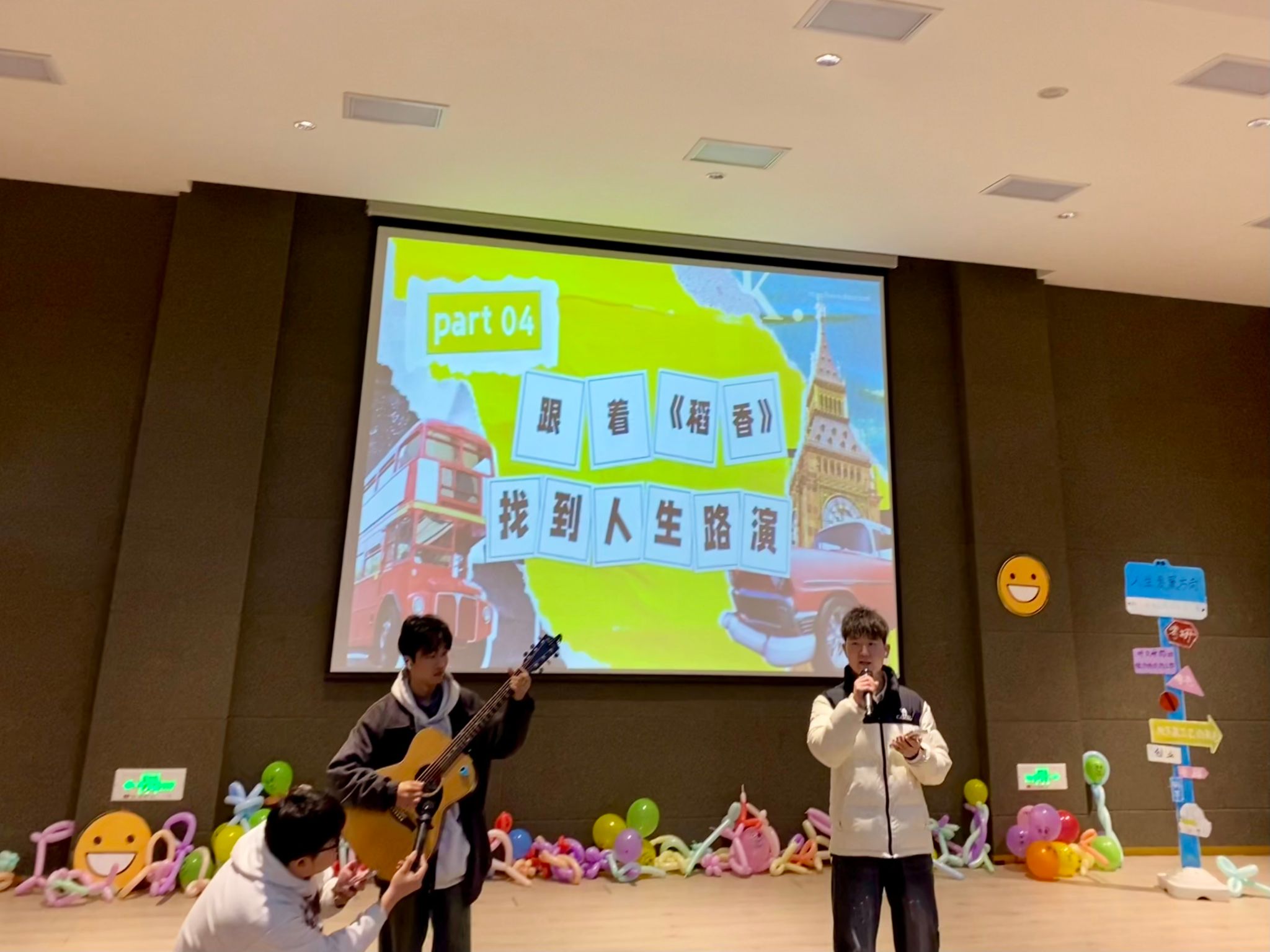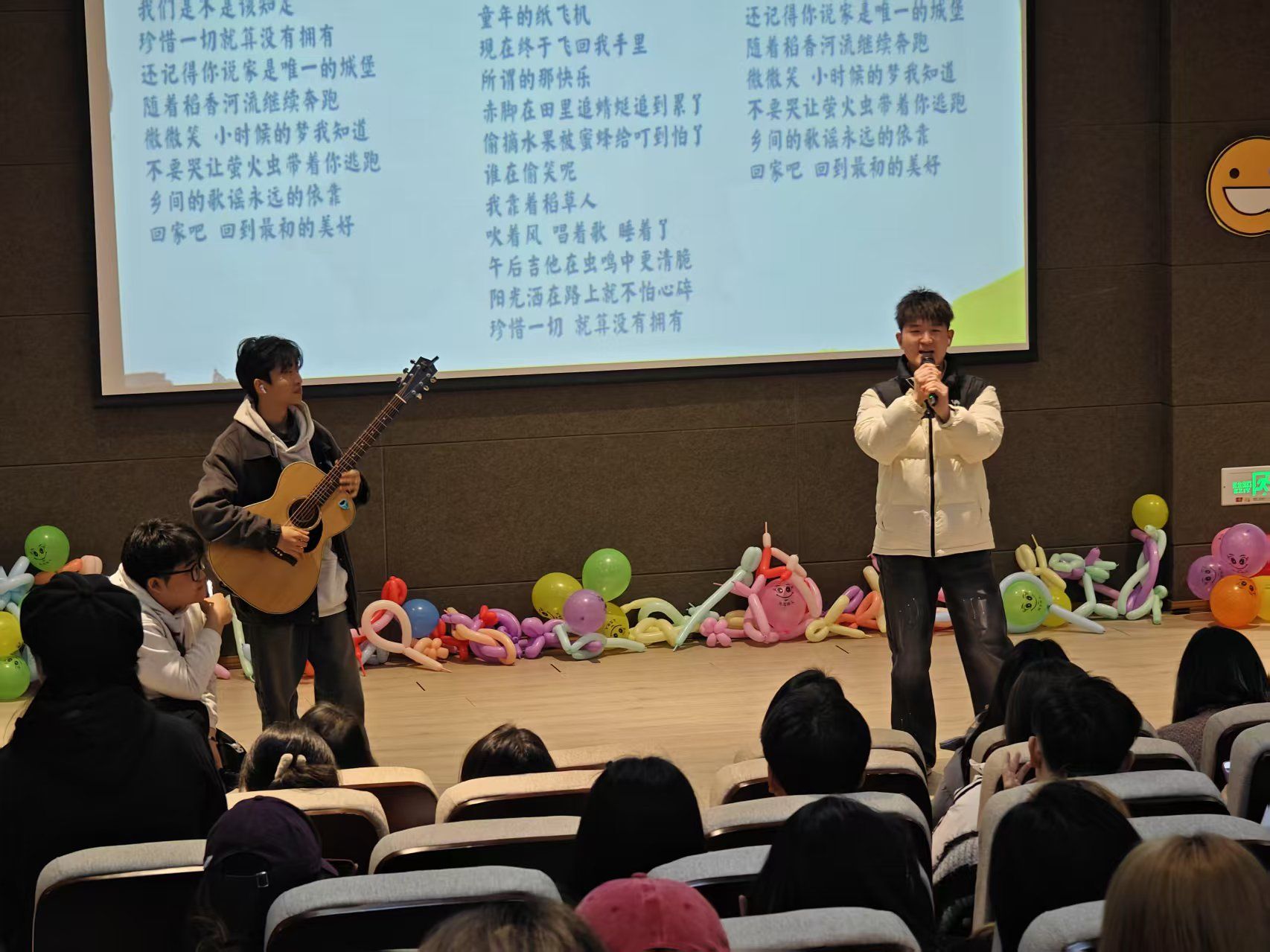 活动进行至中期,现场氛围迎来温馨转折。谢林峰同学以灵动的吉他弹奏为引,毛涛同学温暖的歌声随之流淌,共同演绎一曲《稻香》。熟悉的旋律瞬间点燃大家的热情,驱散同学们心头的紧张与疲惫,沉浸于青春的美好。